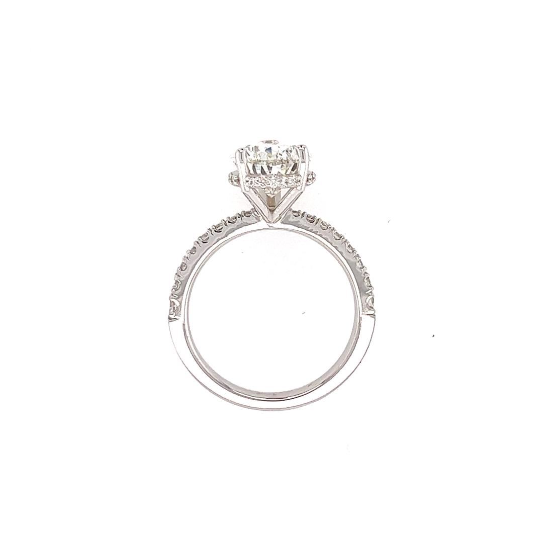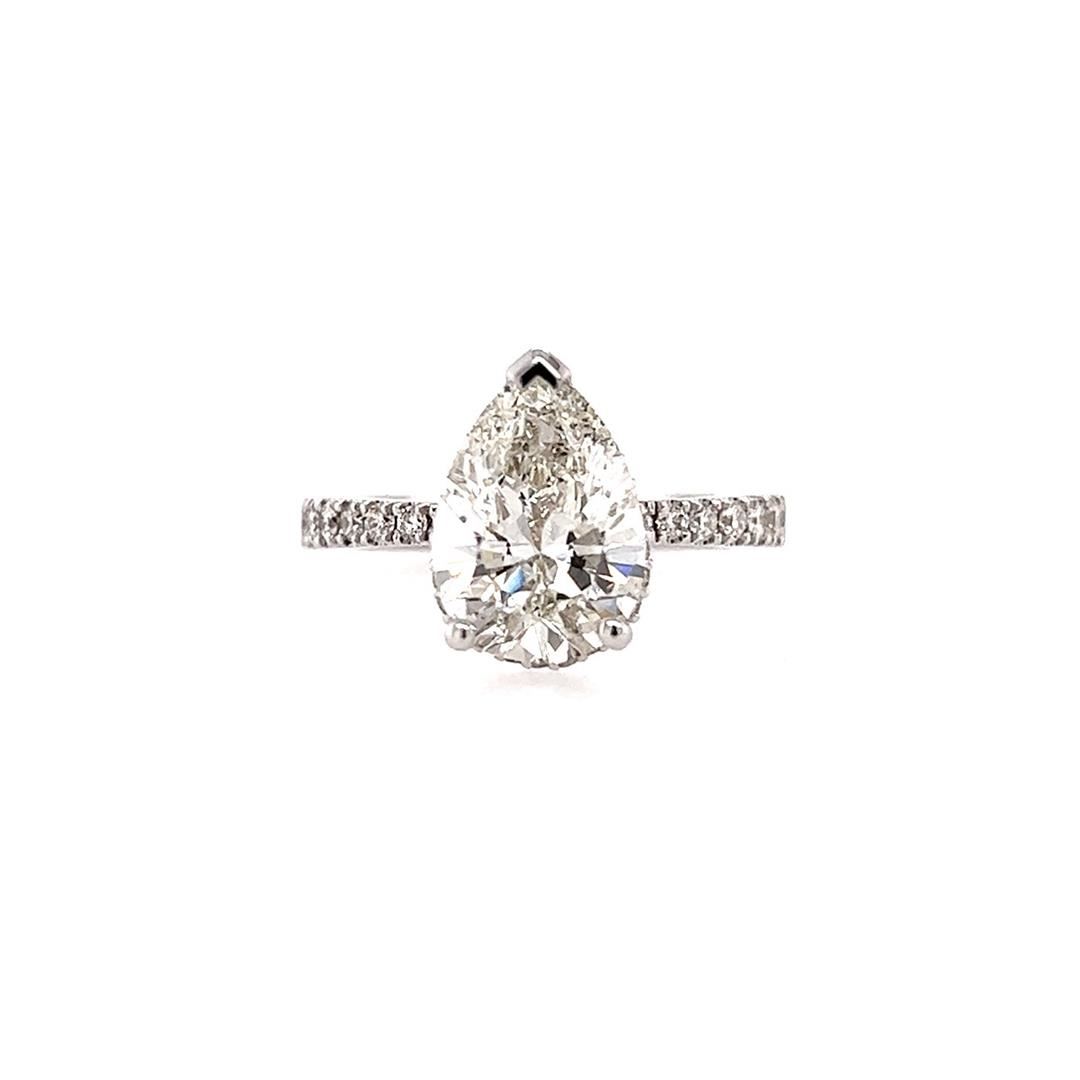 One electronically tested 14KT white gold lady's combination cast & assembled fashion hidden halo ring with a straight line shank with a bright polish finish. Condition is new, good workmanship. The featured lady's ring has a tapered shank that measures 2.80 millimeters in width. Identified with markings of "14K". Containing: One prong set pear shaped cut diamond, measuring 11.73 x 8.34 x 5.36mm (depth est.) approximate weight of 3.19ct. EGL USA laboratory Report# 924706501D. Color - F, Clarity - SI-1, Cut - Very Good, Eighteen prong set round brilliant cut diamonds, meauring 2.20 - 1.50 x 1.15mm (depth est.) approximate total weight of 18 stones = 0.45ct. Graded in the setting. Color - G-H, Clarity - VS-1 to SI-1, Cut - Very Good. Twenty-three prong set round brilliant cut diamonds, measuring 1 x 1 x 0.62mm (depth est.) approximate total weight of 23 stones = 0.10ct. Graded in the setting. Color - G-H, Clarity - VS-2 to SI-1, Cut - Very Good. Total weight of Diamonds 3.74ct. Total weight of ring 4.50gm. Total Estimated Retail Value $96500.00. Appraisal# 000022332000