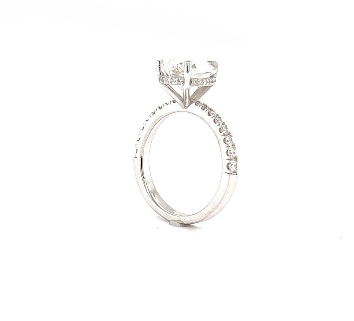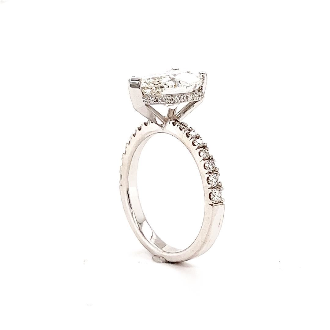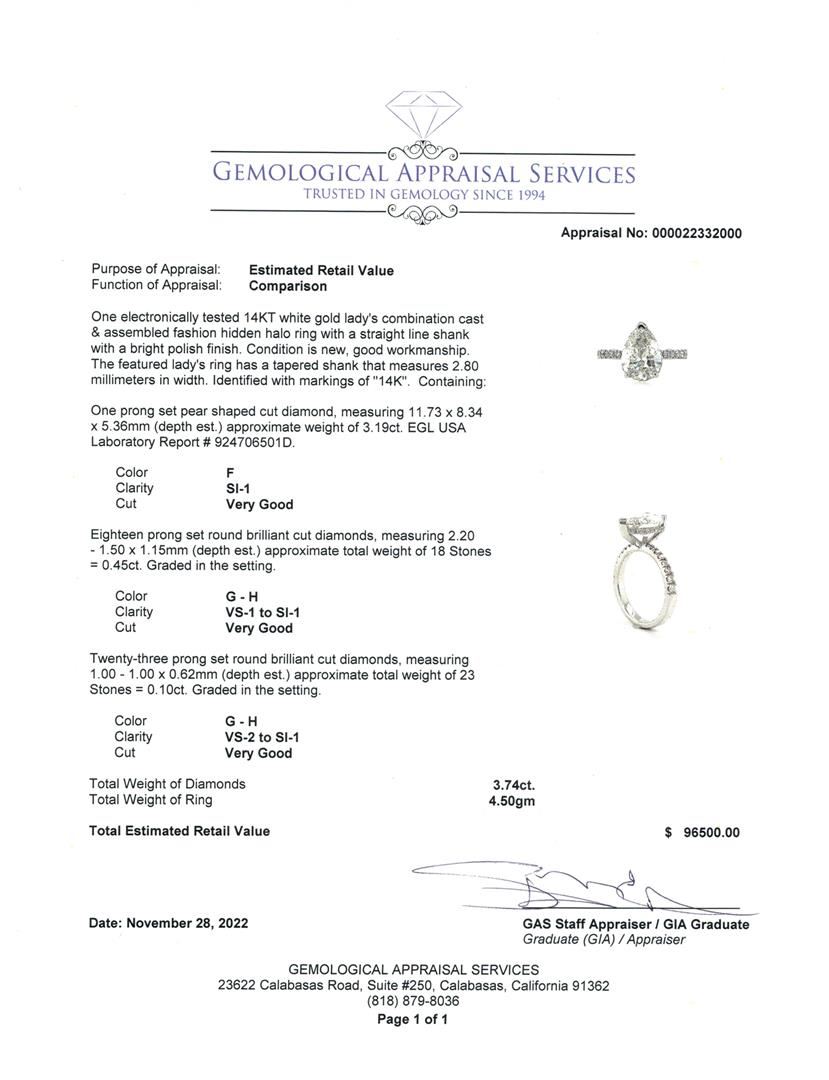 One electronically tested 14KT white gold lady's combination cast & assembled fashion hidden halo ring with a straight line shank with a bright polish finish. Condition is new, good workmanship. The featured lady's ring has a tapered shank that measures 2.80 millimeters in width. Identified with markings of "14K". Containing: One prong set pear shaped cut diamond, measuring 11.73 x 8.34 x 5.36mm (depth est.) approximate weight of 3.19ct. EGL USA laboratory Report# 924706501D. Color - F, Clarity - SI-1, Cut - Very Good, Eighteen prong set round brilliant cut diamonds, meauring 2.20 - 1.50 x 1.15mm (depth est.) approximate total weight of 18 stones = 0.45ct. Graded in the setting. Color - G-H, Clarity - VS-1 to SI-1, Cut - Very Good. Twenty-three prong set round brilliant cut diamonds, measuring 1 x 1 x 0.62mm (depth est.) approximate total weight of 23 stones = 0.10ct. Graded in the setting. Color - G-H, Clarity - VS-2 to SI-1, Cut - Very Good. Total weight of Diamonds 3.74ct. Total weight of ring 4.50gm. Total Estimated Retail Value $96500.00. Appraisal# 000022332000