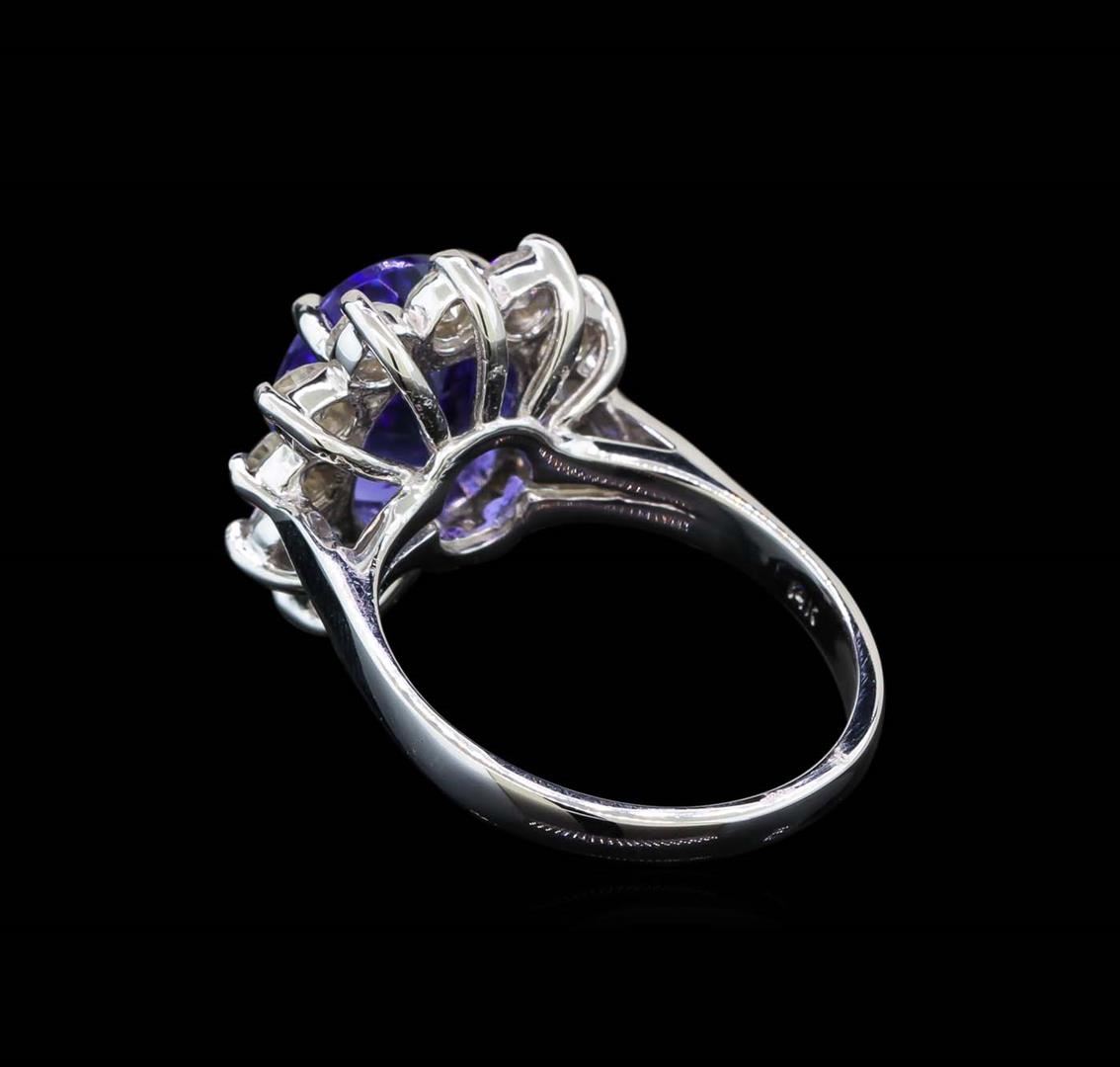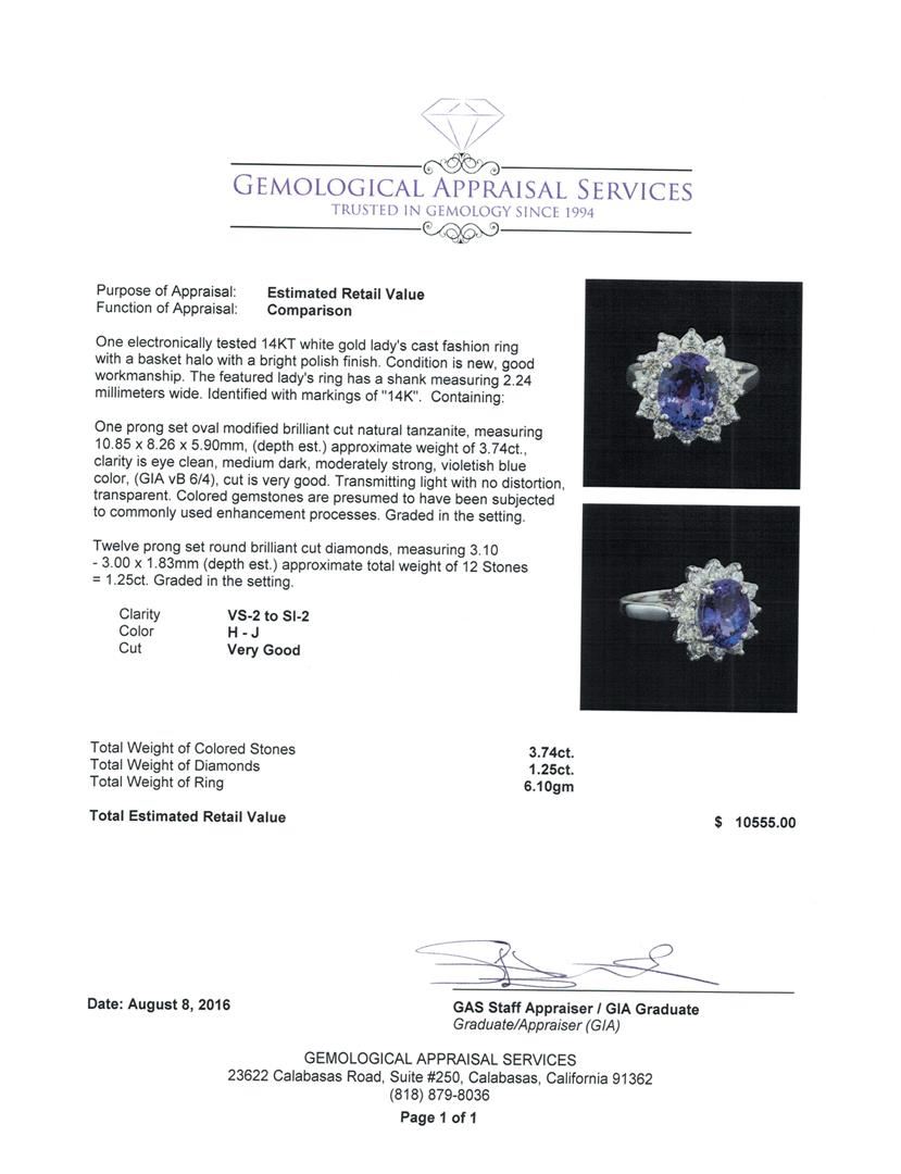 One electronically tested 14KT white gold lady's cast fashion ring with a basket halo with a bright polish finish. The featured lady's ring has a shank measuring 2.24 millimeters wide. Identified with markings of '14K'. Condition is new, good workmanship. Containing: One prong set oval modified brilliant cut natural tanzanite, measuring 10.85 x 8.26 x 5.90mm, (depth est.) approximate weight of 3.74ct., clarity is eye clean, medium dark, moderately strong, violetish blue color, (GIA vB 6/4), cut is very good. Transmitting light with no distortion, transparent. Colored gemstones are presumed to have been subjected to commonly used enhancement processes. Graded in the setting. Twelve prong set round brilliant cut diamonds, measuring 3.10 - 3.00 x 1.83mm (depth est.) approximate total weight of 12 Stones = 1.25ct. Graded in the setting. Clarity VS-2 to SI-2. Color: H - J Cut Very Good. Total Weight of Colored Stones 3.74ct.. Total Weight of Diamonds 1.25ct.. Total Weight of Ring 6.10gm. GAS Appraised at $10,555.00.