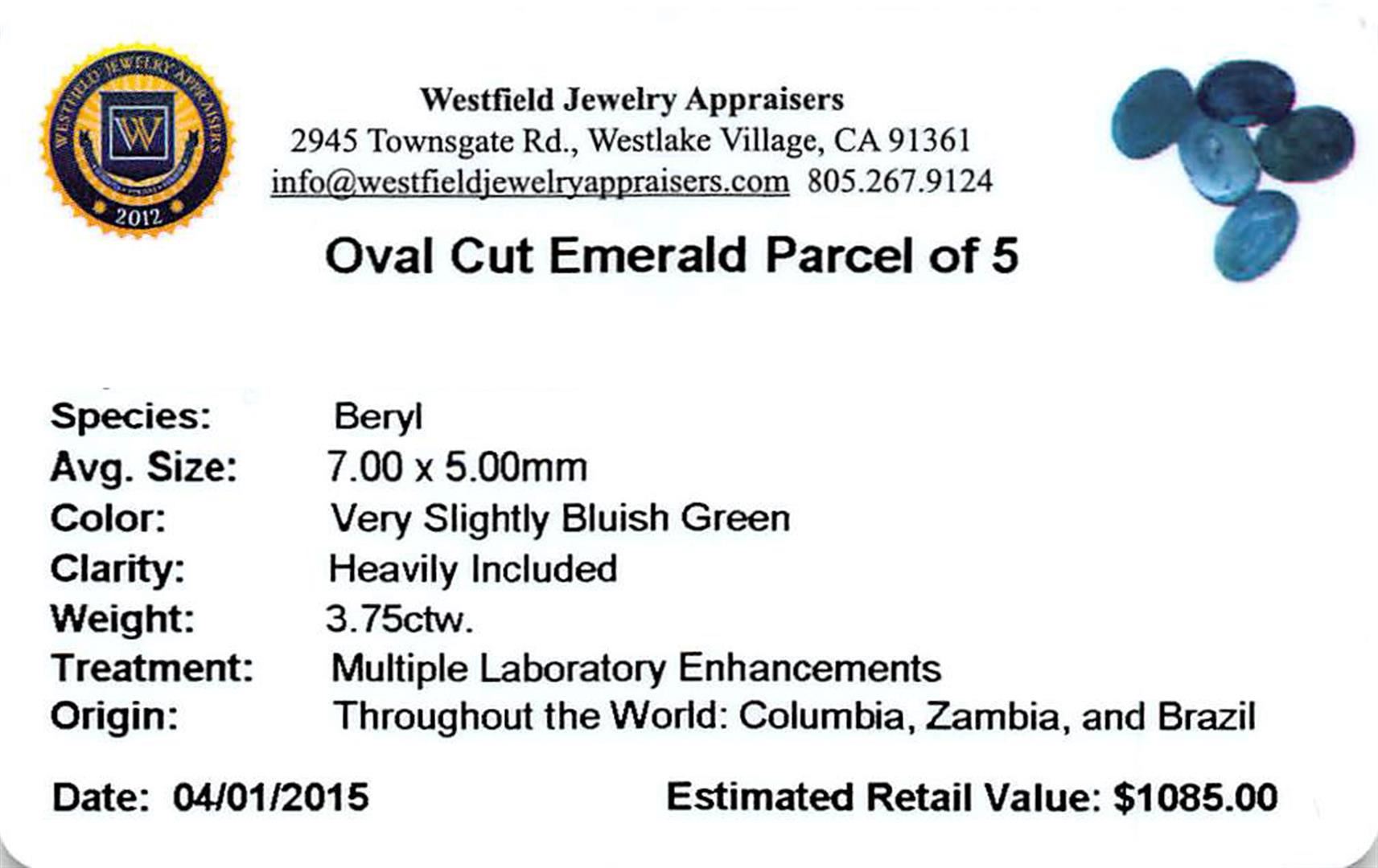 Five oval mixed cut natural emeralds exact total weight 3.75ct., clarity is heavily included, type III, medium dark, slightly grayish, very slightly bluish green color, (GIA vslbG 6/2), cut is good. Westfield Appraised.