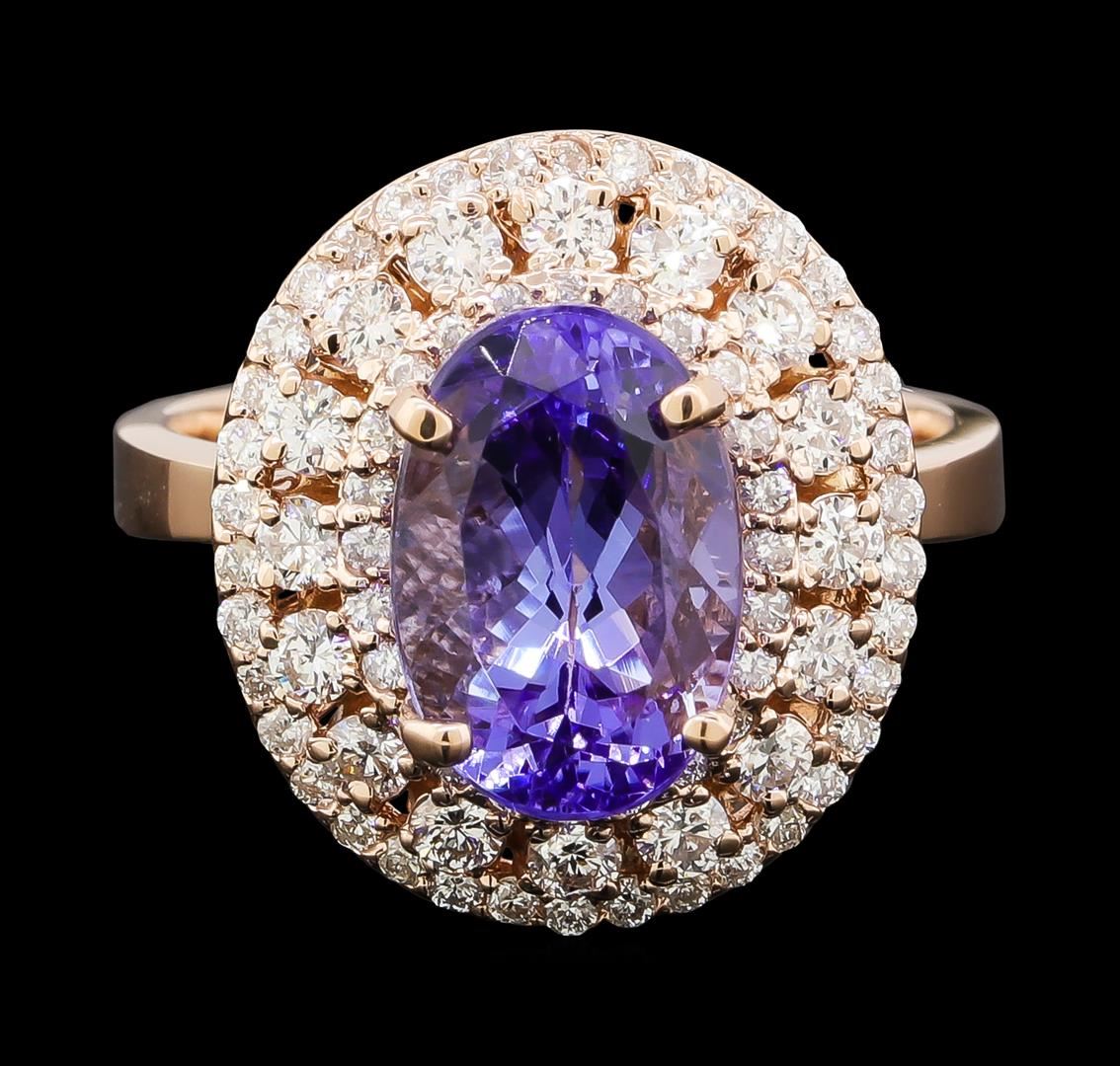One electronically tested 14KT rose gold lady's cast fashion ring with a triple basket halo with a bright polish finish. The featured lady's ring has a shank measuring 3.32 millimeters wide. Identified with markings of 'K14'. Condition is new, good workmanship. Containing: One prong set oval modified brilliant cut natural tanzanite, measuring 11.26 x 7.62 x 5.97mm, (depth est.) approximate weight of 3.75ct., clarity is eye clean, medium, moderately strong, violet color, (GIA V 5/4), cut is very good. Transmitting light with no distortion, transparent. Colored gemstones are presumed to have been subjected to commonly used enhancement processes. Graded in the setting. Sixteen prong set round brilliant cut diamonds, measuring 2.10 - 2.00 x 1.27mm (depth est.) approximate total weight of 16 Stones = 0.52ct. Graded in the setting. Clarity SI-1 to I-1. Color: H - I Cut Good Sixty-Two prong set round brilliant cut diamonds, measuring 1.35 - 1.15 x 0.78mm (depth est.) approximate total weight of 62 Stones = 0.48ct. Graded in the setting. Clarity SI-1 to I-1. Color: H - I Cut Good. Total Weight of Colored Stones 3.75ct.. Total Weight of Diamonds 1.00ct.. Total Weight of Ring 7.10gm. GAS Appraised at $9,430.00.