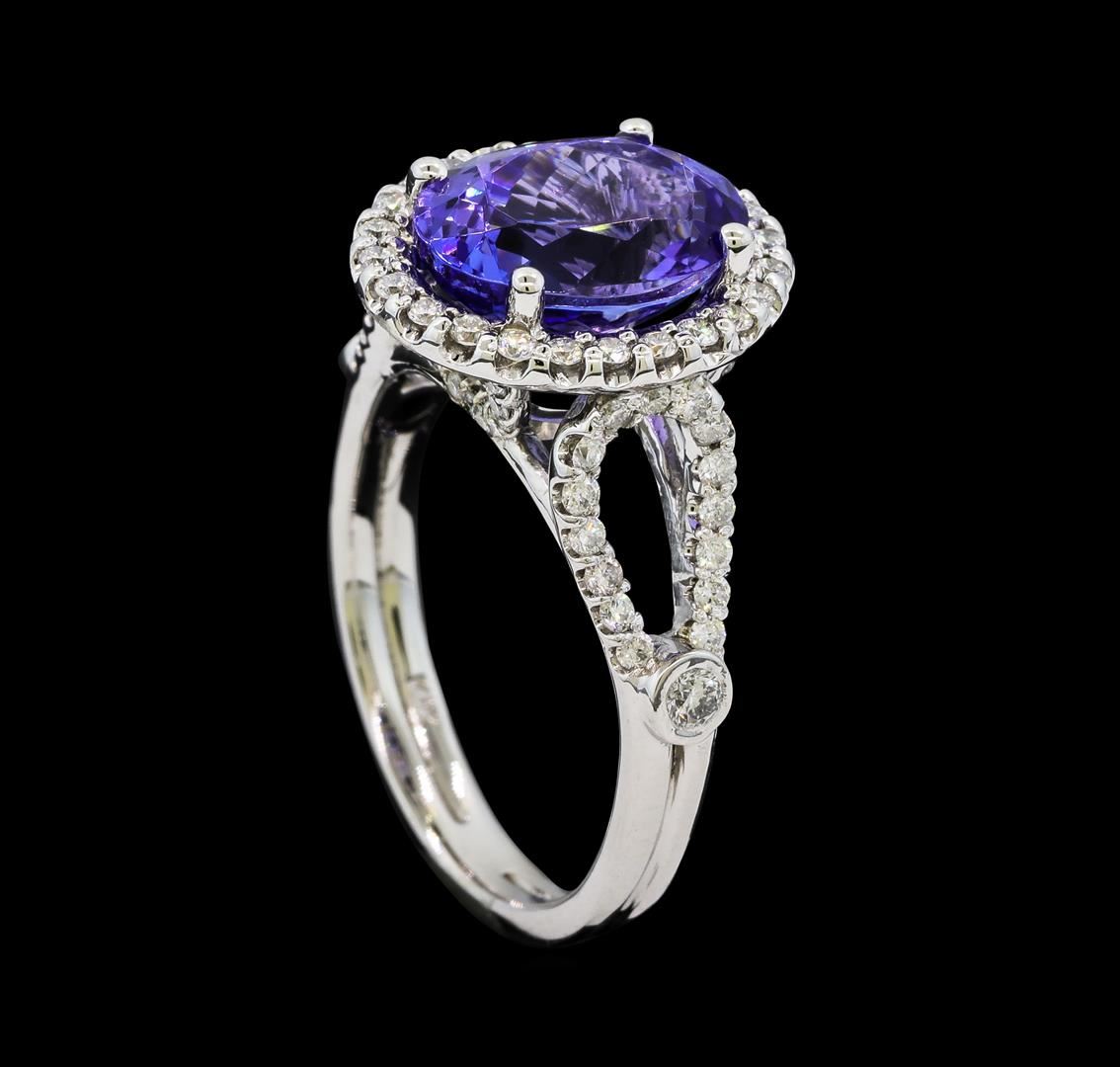 One electronically tested 14KT white gold lady's cast fashion ring with a split shank basket halo with a bright polish finish. The featured lady's ring has a double shank measuring 2.83 millimeters wide. Identified with markings of '14K'. Condition is new, good workmanship. Containing: One prong set oval modified brilliant cut natural tanzanite, measuring 10.84 x 8.04 x 5.95mm, (depth est.) approximate weight of 3.75ct., clarity is eye clean, medium dark, moderately strong, violetish blue color, (GIA vB 6/4), cut is very good. Transmitting light with no distortion, transparent. Colored gemstones are presumed to have been subjected to commonly used enhancement processes. Graded in the setting. Two bezel set round brilliant cut diamonds, measuring 2.30 - 2.20 x 1.35mm (depth est.) approximate total weight of 2 Stones = 0.08ct. Graded in the setting. Clarity SI-1 to SI-2. Color: G - H Cut Good Fifty-Four prong set round brilliant cut diamonds, measuring 1.35 - 1.30 x 0.82mm (depth est.) approximate total weight of 54 Stones = 0.48ct. Graded in the setting. Clarity SI-1 to I-1. Color: H - I Cut Good Twenty-Two prong set round brilliant cut diamonds, measuring 1.25 - 1.15 x 0.72mm (depth est.) approximate total weight of 22 Stones = 0.14ct. Graded in the setting. Clarity SI-1 to I-1. Color: G - H Cut Good. Total Weight of Colored Stones 3.75ct.. Total Weight of Diamonds 0.70ct.. Total Weight of Ring 5.30gm. GAS Appraised at $9,460.00.
