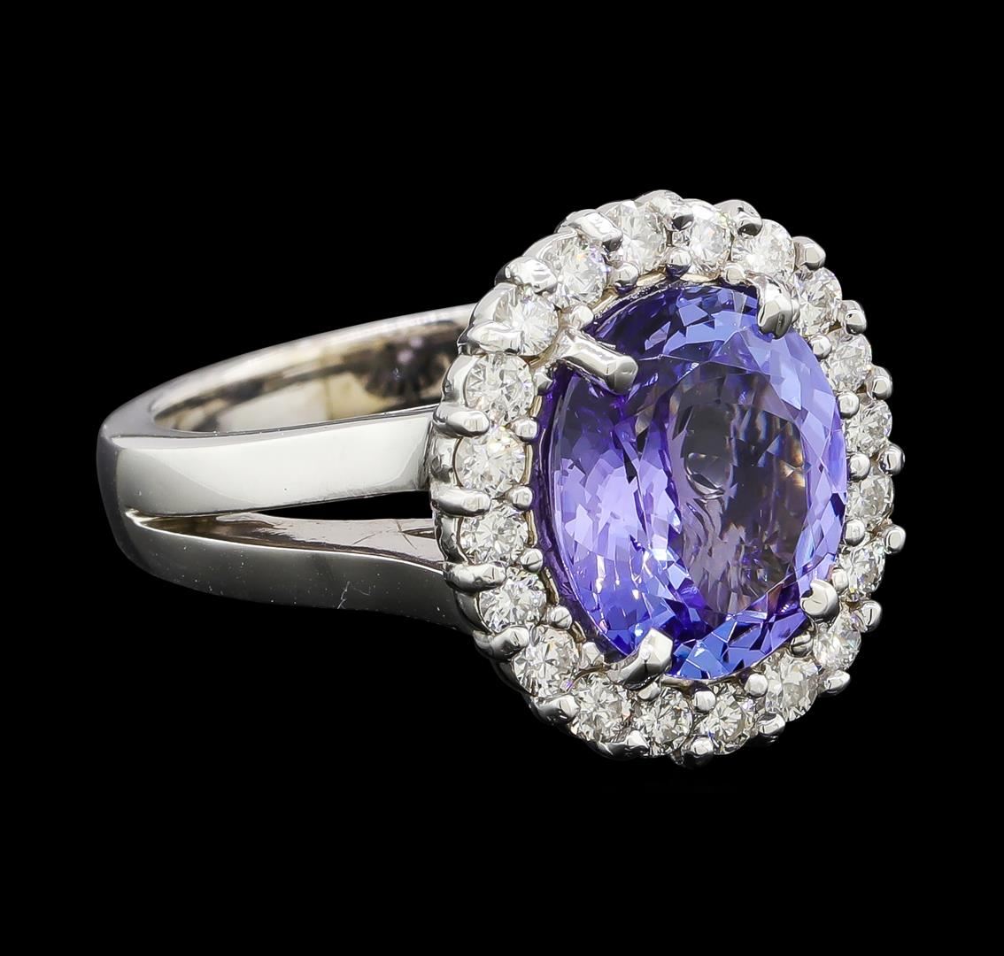 One electronically tested 14KT white gold lady's cast fashion ring with a split shank basket halo with a bright polish finish. The featured lady's ring has a shank measuring 3.11 millimeters wide. Identified with markings of '14K'. Condition is new, good workmanship. Containing: One prong set oval modified brilliant cut natural tanzanite, measuring 11.00 x 9.05 x 5.20mm, (depth est.) approximate weight of 3.75ct., clarity is eye clean, medium, moderately strong, bluish violet color, (GIA bV 5/4), cut is very good. Transmitting light with no distortion, transparent. Colored gemstones are presumed to have been subjected to commonly used enhancement processes. Graded in the setting. Twenty prong set round brilliant cut diamonds, measuring 2.10 - 2.00 x 1.23mm (depth est.) approximate total weight of 20 Stones = 0.62ct. Graded in the setting. Clarity SI-1 to SI-2. Color: H - I Cut Good. Total Weight of Colored Stones 3.75ct.. Total Weight of Diamonds 0.62ct.. Total Weight of Ring 9.10gm. GAS Appraised at $8,685.00.