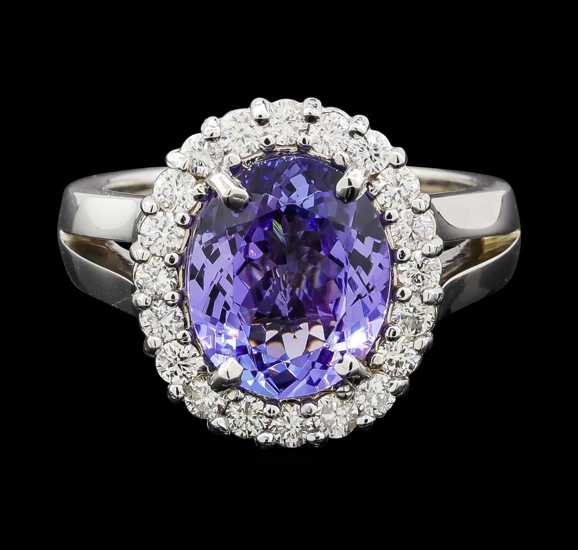 One electronically tested 14KT white gold lady's cast fashion ring with a split shank basket halo with a bright polish finish. The featured lady's ring has a shank measuring 3.11 millimeters wide. Identified with markings of '14K'. Condition is new, good workmanship. Containing: One prong set oval modified brilliant cut natural tanzanite, measuring 11.00 x 9.05 x 5.20mm, (depth est.) approximate weight of 3.75ct., clarity is eye clean, medium, moderately strong, bluish violet color, (GIA bV 5/4), cut is very good. Transmitting light with no distortion, transparent. Colored gemstones are presumed to have been subjected to commonly used enhancement processes. Graded in the setting. Twenty prong set round brilliant cut diamonds, measuring 2.10 - 2.00 x 1.23mm (depth est.) approximate total weight of 20 Stones = 0.62ct. Graded in the setting. Clarity SI-1 to SI-2. Color: H - I Cut Good. Total Weight of Colored Stones 3.75ct.. Total Weight of Diamonds 0.62ct.. Total Weight of Ring 9.10gm. GAS Appraised at $8,685.00.