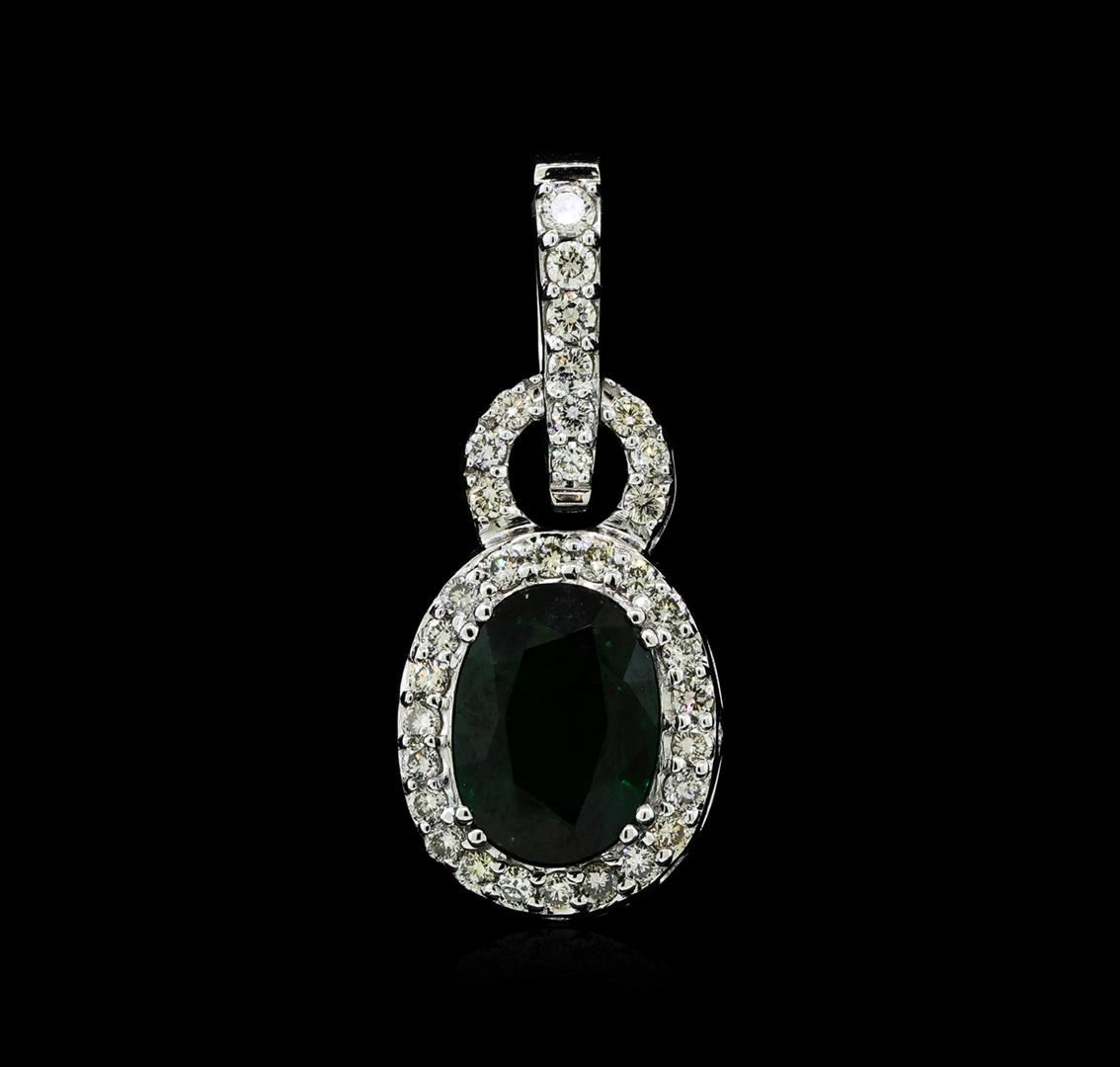 One electronically tested 14KT white gold lady's combination cast & assembled fashion pendant with a halo with a bright polish finish. The featured lady's pendant measures 23 millimeters in length. Identified with markings of '14K'. Condition is new, good workmanship. Containing: One prong set oval modified mixed cut natural tsavorite garnet, measuring 10.36 x 7.62 x 5.36mm, (depth est.) 15%. bulge factor, approximate weight of 3.75ct., clarity is eye clean, medium dark, strong, green color, (GIA G 6/5), cut is very good. Transmitting light with no distortion, transparent. Colored gemstones are presumed to have been subjected to commonly used enhancement processes. Graded in the setting. Three prong set round brilliant cut diamonds, measuring 2.00 - 1.90 x 1.21mm (depth est.) approximate total weight of 3 Stones = 0.08ct. Graded in the setting. Clarity SI-1 to SI-2. Color: H - I Cut Good Thirty prong set round brilliant cut diamonds, measuring 1.65 - 1.55 x 0.99mm (depth est.) approximate total weight of 30 Stones = 0.47ct. Graded in the setting. Clarity VS-2 to SI-1. Color: H - J Cut Good. Total Weight of Colored Stones 3.75ct.. Total Weight of Diamonds 0.55ct.. Total Weight of Pendant 3.90gm GAS Appraised at $16,185.00.