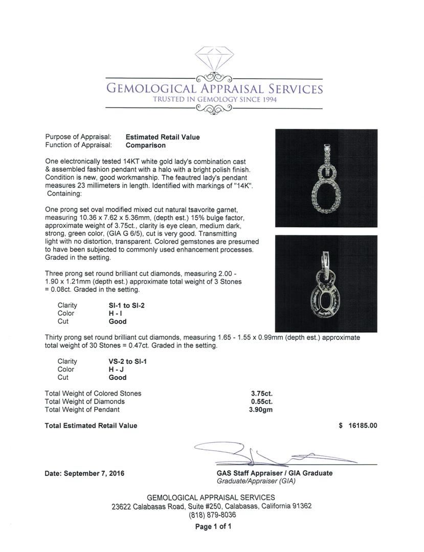 One electronically tested 14KT white gold lady's combination cast & assembled fashion pendant with a halo with a bright polish finish. The featured lady's pendant measures 23 millimeters in length. Identified with markings of '14K'. Condition is new, good workmanship. Containing: One prong set oval modified mixed cut natural tsavorite garnet, measuring 10.36 x 7.62 x 5.36mm, (depth est.) 15%. bulge factor, approximate weight of 3.75ct., clarity is eye clean, medium dark, strong, green color, (GIA G 6/5), cut is very good. Transmitting light with no distortion, transparent. Colored gemstones are presumed to have been subjected to commonly used enhancement processes. Graded in the setting. Three prong set round brilliant cut diamonds, measuring 2.00 - 1.90 x 1.21mm (depth est.) approximate total weight of 3 Stones = 0.08ct. Graded in the setting. Clarity SI-1 to SI-2. Color: H - I Cut Good Thirty prong set round brilliant cut diamonds, measuring 1.65 - 1.55 x 0.99mm (depth est.) approximate total weight of 30 Stones = 0.47ct. Graded in the setting. Clarity VS-2 to SI-1. Color: H - J Cut Good. Total Weight of Colored Stones 3.75ct.. Total Weight of Diamonds 0.55ct.. Total Weight of Pendant 3.90gm GAS Appraised at $16,185.00.