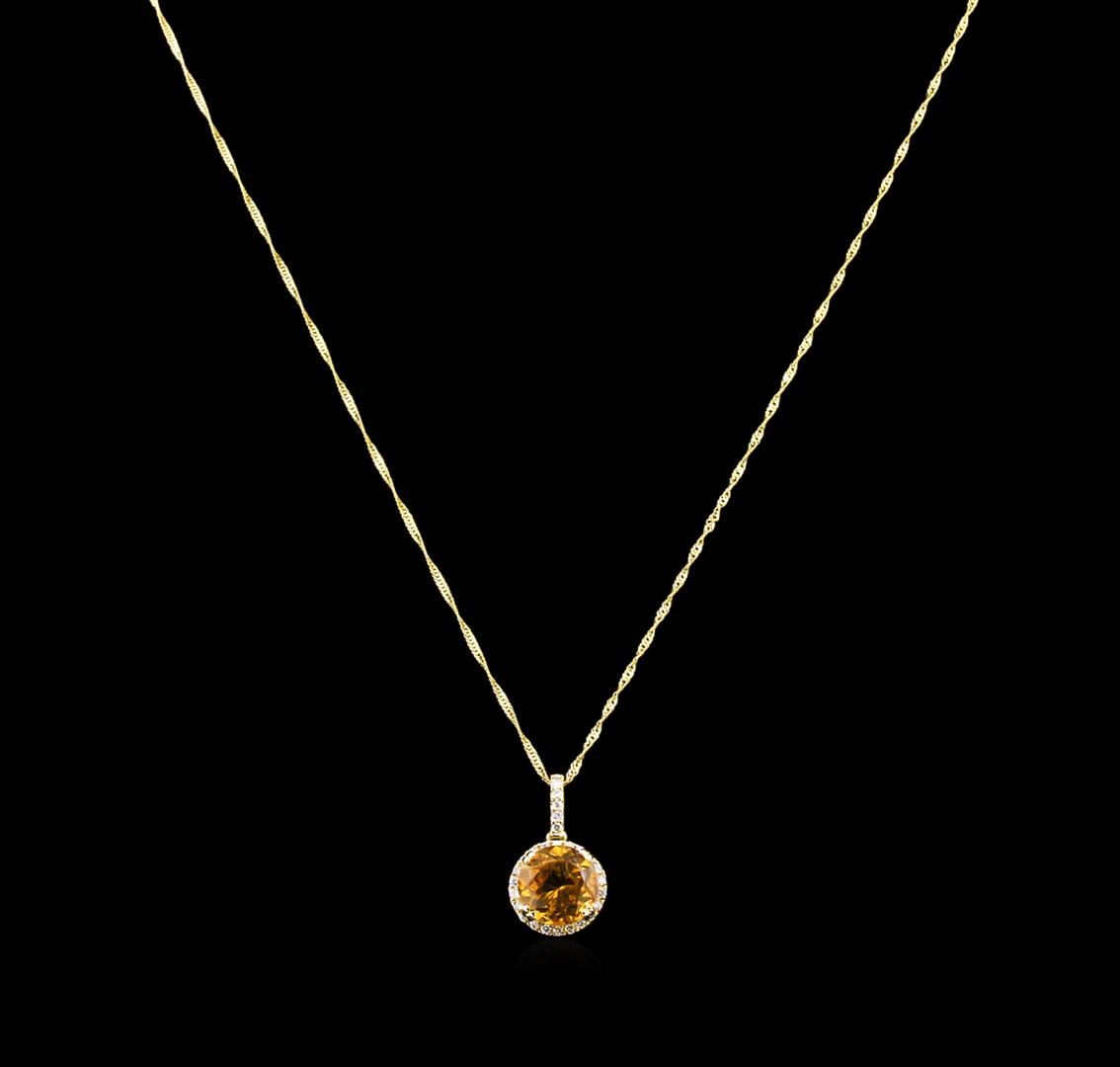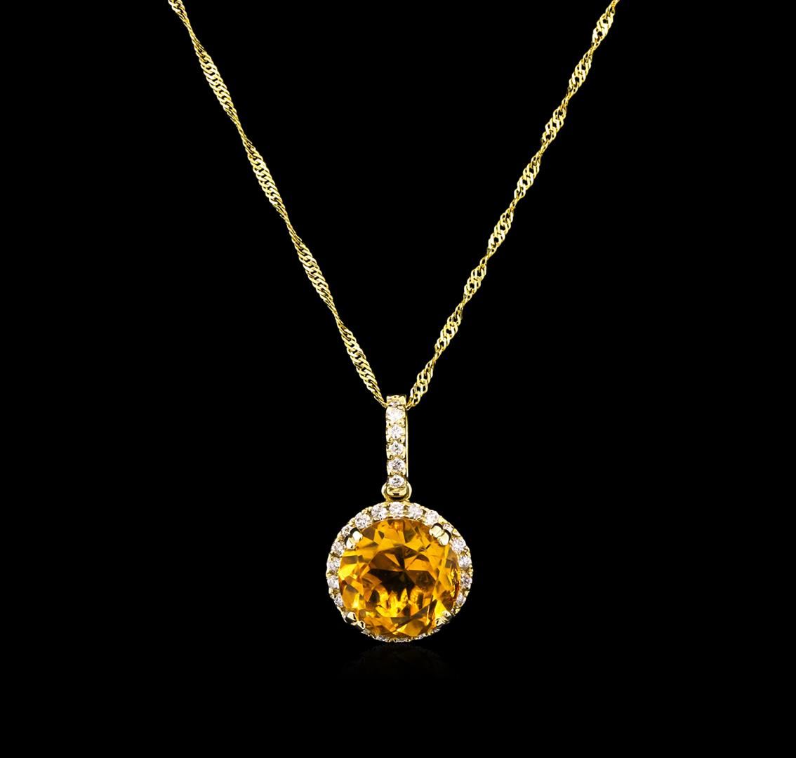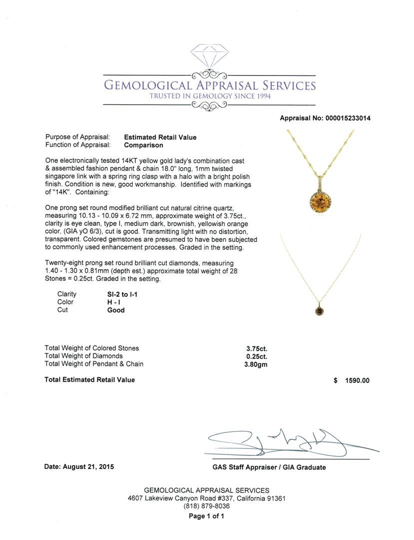 One electronically tested 14KT yellow gold lady's combination cast & assembled fashion pendant & chain 18.0" long, 1mm twisted Singapore link with a spring ring clasp with a halo with a bright polish finish. Identified with markings of "14K". Condition is new, good workmanship. Containing: One prong set round modified brilliant cut natural citrine quartz, measuring 10.13 - 10.09 x 6.72 mm, approximate weight of 3.75ct., clarity is eye clean, type I, medium dark, brownish, yellowish orange color, (GIA yO 6/3), cut is good. Transmitting light with no distortion, transparent. Colored gemstones are presumed to have been subjected to commonly used enhancement processes. Graded in the setting. Twenty-Eight prong set round brilliant cut diamonds, measuring 1.40 - 1.30 x 0.81mm (depth est.) approximate total weight of 28 Stones = 0.25ct. Graded in the setting. Clarity: SI-2 to I-1. Color: H - I. Cut Good. Total Weight of Colored Stones 3.75ct. Total Weight of Diamonds 0.25ct. Total Weight of Pendant & Chain 3.80gm. GAS Appraised at $1,590.00.