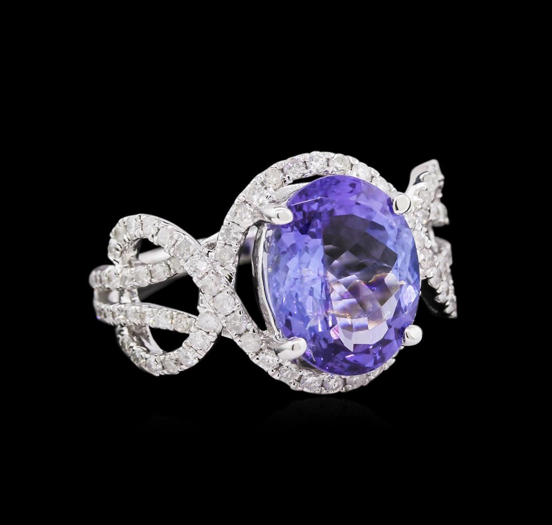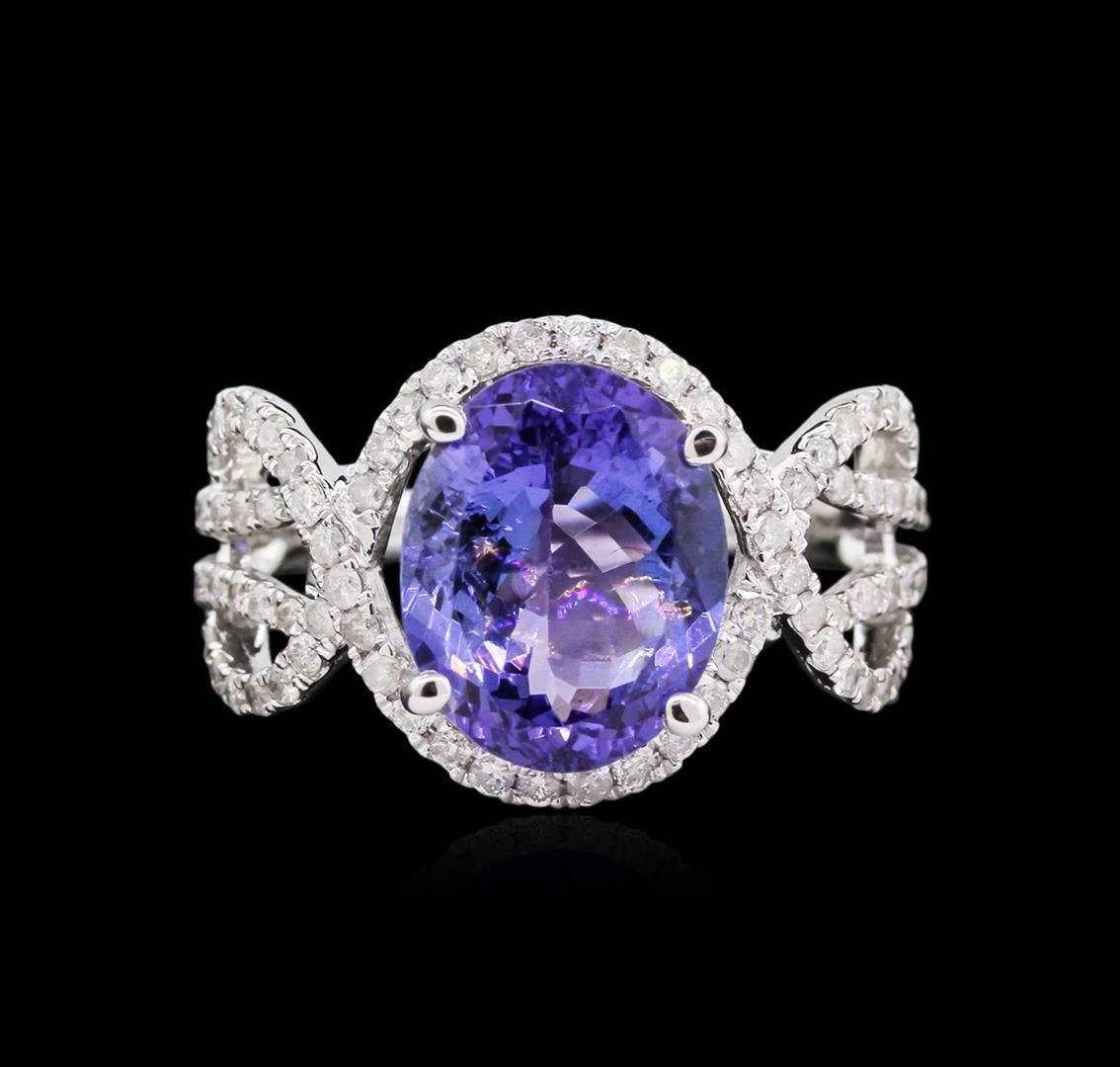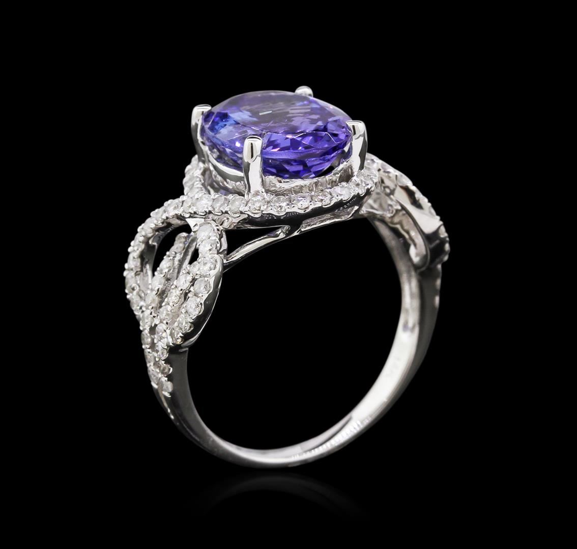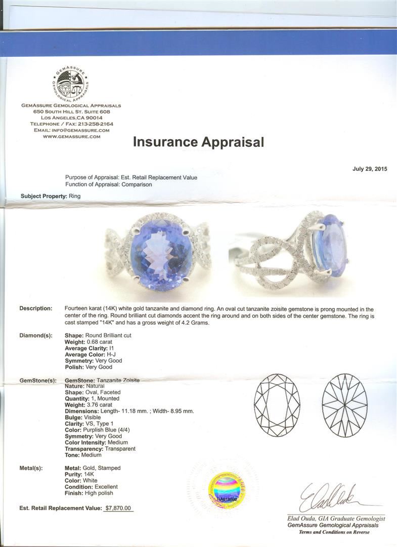 One 14KT white gold tanzanite and diamond ring. An oval cut tanzanite zoisite gemstone is prong mounted in the center of the ring. Round brilliant cut diamonds accent the ring around the center gemstone and on both sides. The ring is cast stamped "14K" and has a gross weight of 4.2 Grams. Diamond(s): Shape: Round Brilliant Cut. Weight: 0.68 carat. Average Clarity: I1. Average Color: H-J. Symmetry: Very Good. Polish: Very Good. GemStone(s): Tanzanite Zoisite. Nature: Natural. Shape: Oval, Faceted. Quantity: 1, Mounted. Weight: 3.76 carat. Dimensions: Length - 11.18 mm. ; Width - 8.95 mm. Bulge: Visible. Clarity: VS, Type 1. Color: Purplish Blue (4/4). Symmetry: Very Good. Color Intensity: Medium. Transparency: Transparent. Tone: Medium. Metal(s): Metal: Gold, Stamped. Purity: 14K. Color: White. Condition: Excellent. Finish: High polish. GGA Appraised at $7,870.00.