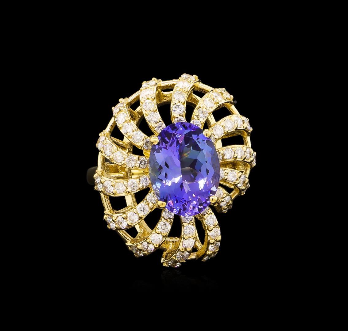 One electronically tested 14KT yellow gold lady's cast fashion ring with a spiral halo with a bright polish finish. The featured lady's ring has a shank measuring 1.93 millimeters wide. Identified with markings of "K14". Condition is new, good workmanship. Containing: One prong set oval modified brilliant cut natural tanzanite, measuring 11.34 x 8.58 x 5.50mm, approximate weight of 3.76ct., clarity is eye clean, type I, medium dark, moderately strong, bluish violet color, (GIA bV 6/4), cut is very good. Transmitting light with no distortion, transparent. Colored gemstones are presumed to have been subjected to commonly used enhancement processes. Graded in the setting. Twenty-Five prong set round brilliant cut diamonds, measuring 1.90 - 1.60 x 1.05mm (depth est.) approximate total weight of 25 Stones = 0.49ct. Graded in the setting. Clarity: SI-1 to I-1. Color: H - I. Cut Good Forty-Two prong set round brilliant cut diamonds, measuring 1.50 - 1.35 x 0.89mm (depth est.) approximate total weight of 42 Stones = 0.46ct. Graded in the setting. Clarity: SI-1 to I-1. Color: H - I. Cut Good. Total Weight of Colored Stones 3.76ct. Total Weight of Diamonds 0.95ct. Total Weight of Ring 7.50gm. GAS Appraised at $9,935.00.