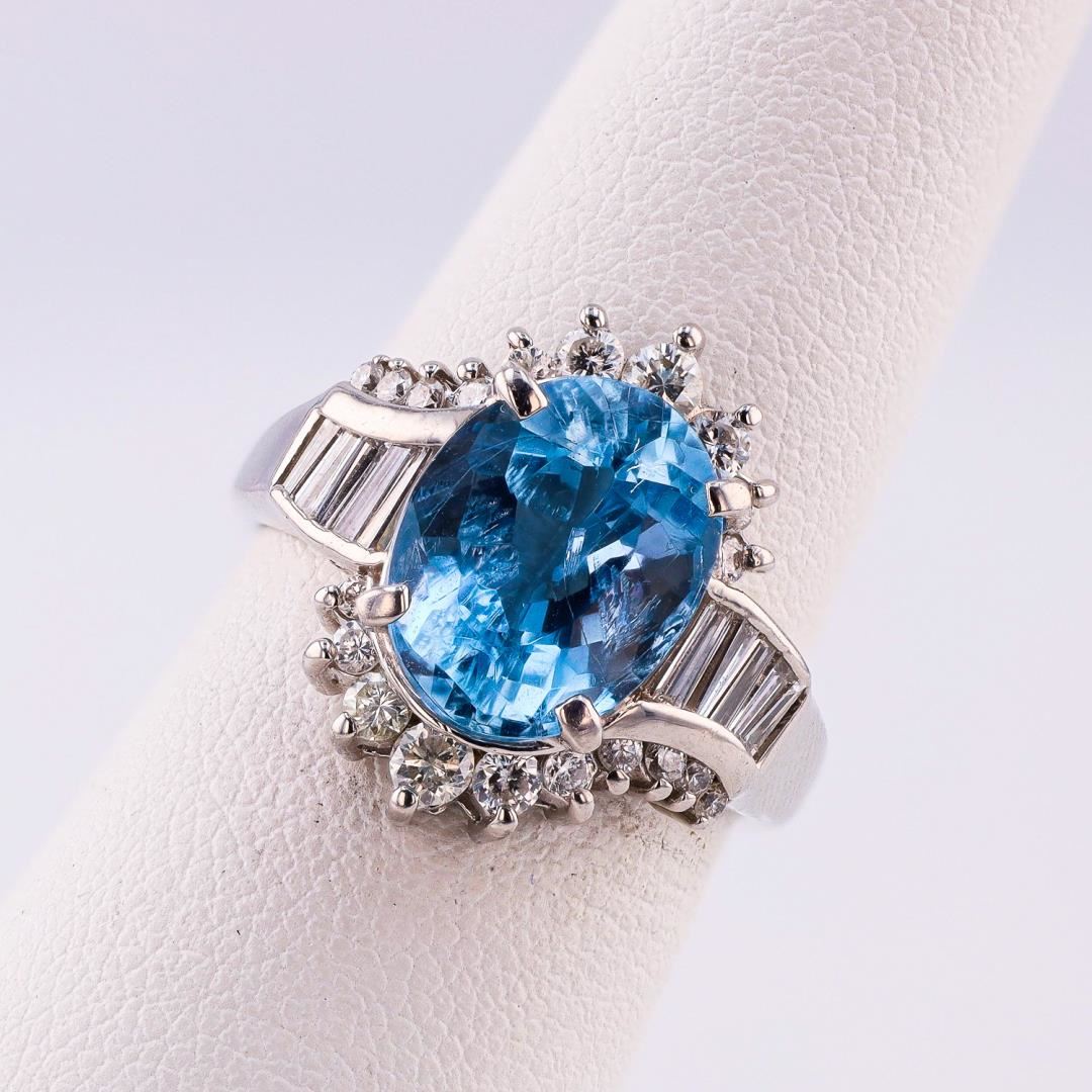 One polished. stamped, and tested platinum 900 ring with a bright finish. The ring is mounted with: 1 genuine aquamarine center stone weighing approximately 3.77 carat, and 30 genuine faceted diamonds weighing approximately 0.75 carats. This item weighs 8.3 grams, condition is new, excellent workmanship. #MAIN GEMSTONE# Species Natural Beryl; Variety: Aquamarine; Shape: Oval; Cutting Style: Modified Brilliant Cut; Measurements: 11.2 x 9.0mm; Weight: 3.77 carat; Color: Light Blue; Cut Grade: Very Good; Refractive Index: 1.577 to 1.583 DR; Birefringence: 0.005 - 0.009; Hardness: 7.5 - 8 #ADJACENT GEMSTONES ON RING# Identity: Natural Diamond; Shape & Cutting Style: Baguette / Round Brilliant; Quantity: 30 Diamonds; Measurements: 1.3 - 2.2mm (20 round), 2.5 - 3.5mm (10 baguette); Total Weight: 0.75 carats; Color Grade: F-G; Clarity Grade: VS2-SI2; Refractive Index: 2.417; Hardness: 10 #AQUAMARINE WEIGHT: 3.77 ct; TOTAL DIAMOND WEIGHT: 0.75 cts; WEIGHT OF ITEM: 8.3 grams; METAL: Platinum 900 #Size: 6 1/2