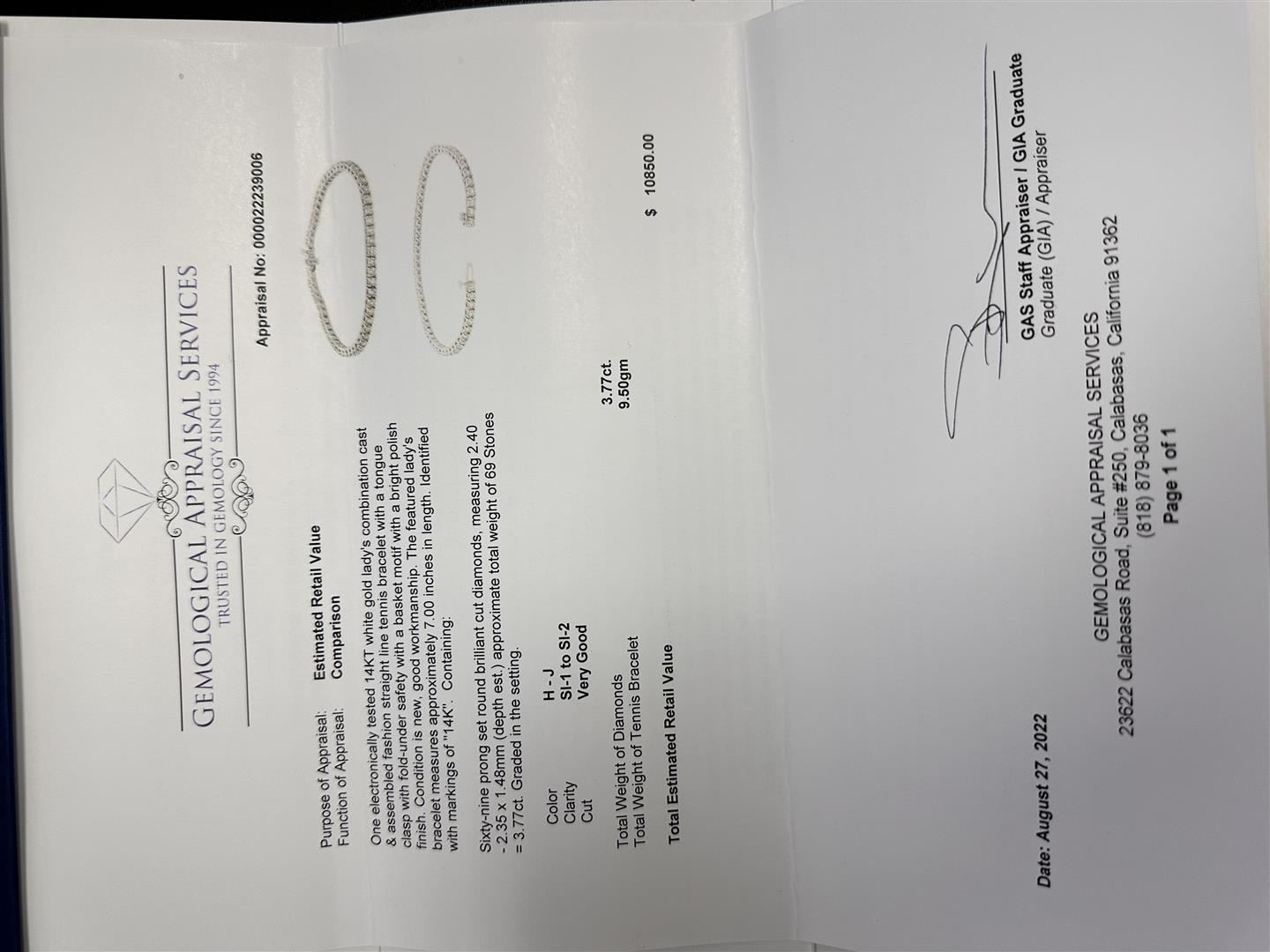 One electronicaly tested 14KT white gold lady's combination cast & assembled fashion straight line tennis bracelet with a tongue clasp with fold-under safety with a basket motif with a bright polish finish. Condition is new. good workmanship. The featured Iady's Bracelet measures approximately 7.00 inches in length. ldentfied with markings of "14K". Containing Sixty-nine prong set round brilliant cut diamonds, measuring 2.40-2.35 X 1.48mm (depth est:.) approximate total weight of 69 Stones = 3.77ct. Graded in the seting. H-J SL-1 to SL-2. Very Good. Total weight of Diamonds: 3.77ct. Total Estimated Retail Value: 10850.00