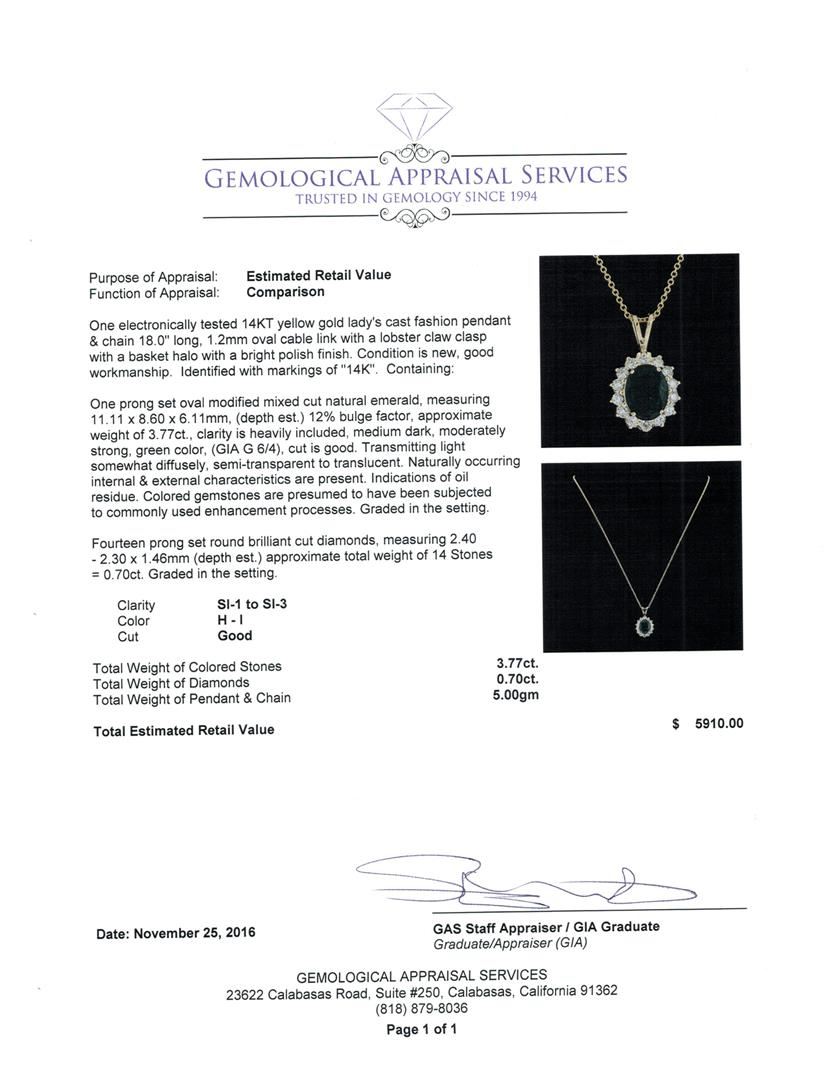 One electronically tested 14KT yellow gold lady's cast fashion pendant & chain 18.0' long, 1.2mm oval cable link with a lobster claw clasp with a basket halo with a bright polish finish. Identified with markings of '14K'. Condition is new, good workmanship. Containing: One prong set oval modified mixed cut natural emerald, measuring 11.11 x 8.60 x 6.11mm, (depth est.) 12%. bulge factor, approximate weight of 3.77ct., clarity is heavily included, medium dark, moderately strong, green color, (GIA G 6/4), cut is good. Transmitting light somewhat diffusely, semi-transparent to translucent. Naturally occurring internal & external characteristics are present. Indications of oil residue. Colored gemstones are presumed to have been subjected to commonly used enhancement processes. Graded in the setting. Fourteen prong set round brilliant cut diamonds, measuring 2.40 - 2.30 x 1.46mm (depth est.) approximate total weight of 14 Stones = 0.70ct. Graded in the setting. Clarity SI-1 to SI-3. Color: H - I Cut Good. Total Weight of Colored Stones 3.77ct.. Total Weight of Diamonds 0.70ct.. Total Weight of Pendant & Chain 5.00gm. GAS Appraised at $5,910.00.