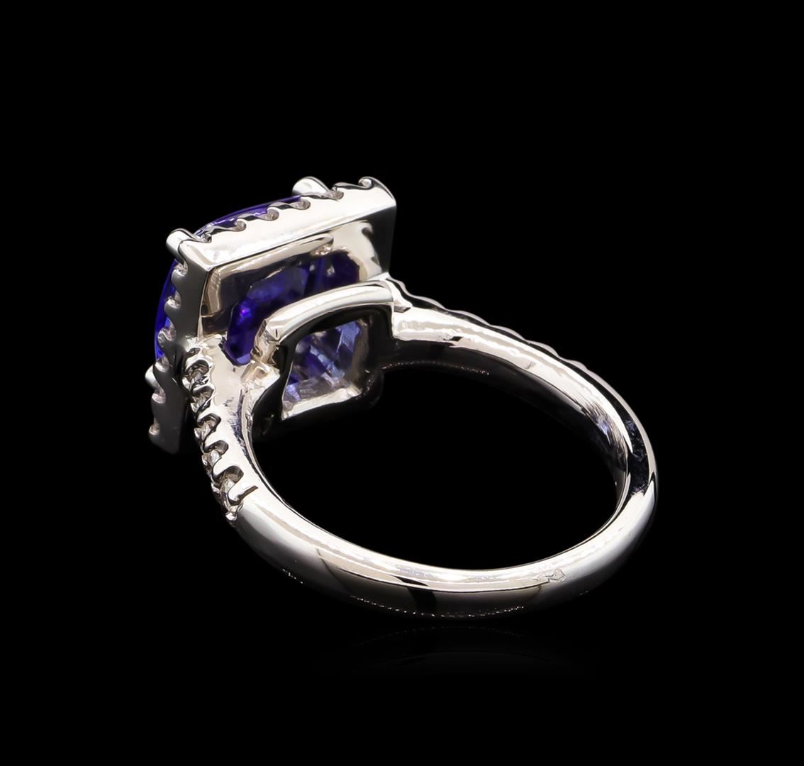 One electronically tested 14KT white gold lady's cast fashion ring with a square halo with a bright polish finish. The featured lady's ring has a shank measuring 2.50 millimeters wide. Identified with markings of "14K". Condition is new, good workmanship. Containing: One prong set square cushion modified brilliant cut natural tanzanite, measuring 9.52 x 9.42 x 5.50mm, approximate weight of 3.77ct., clarity is eye clean, type I, medium, moderately strong, violetish blue color, (GIA vB 5/4), cut is good. Graded in the setting. Thirty prong set round brilliant cut diamonds, measuring 1.70 - 1.60 x 1.01mm (depth est.) approximate total weight of 30 Stones = 0.50ct. Graded in the setting. Clarity: SI-1 to I-1. Color: H - I. Cut Good. Total Weight of Colored Stones 3.77ct. Total Weight of Diamonds 0.50ct. Total Weight of Ring 7.30gm. GAS Appraised at $8,185.00.