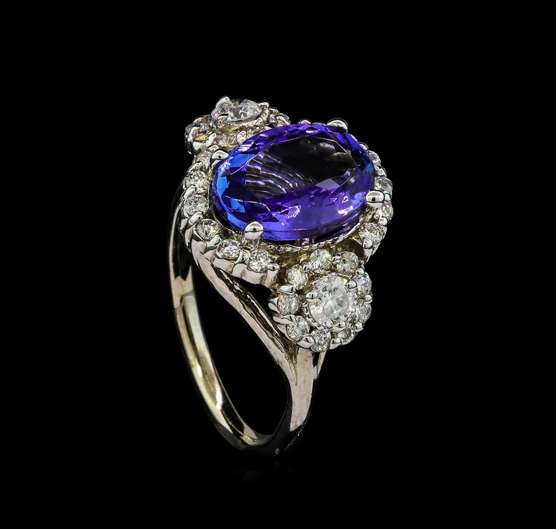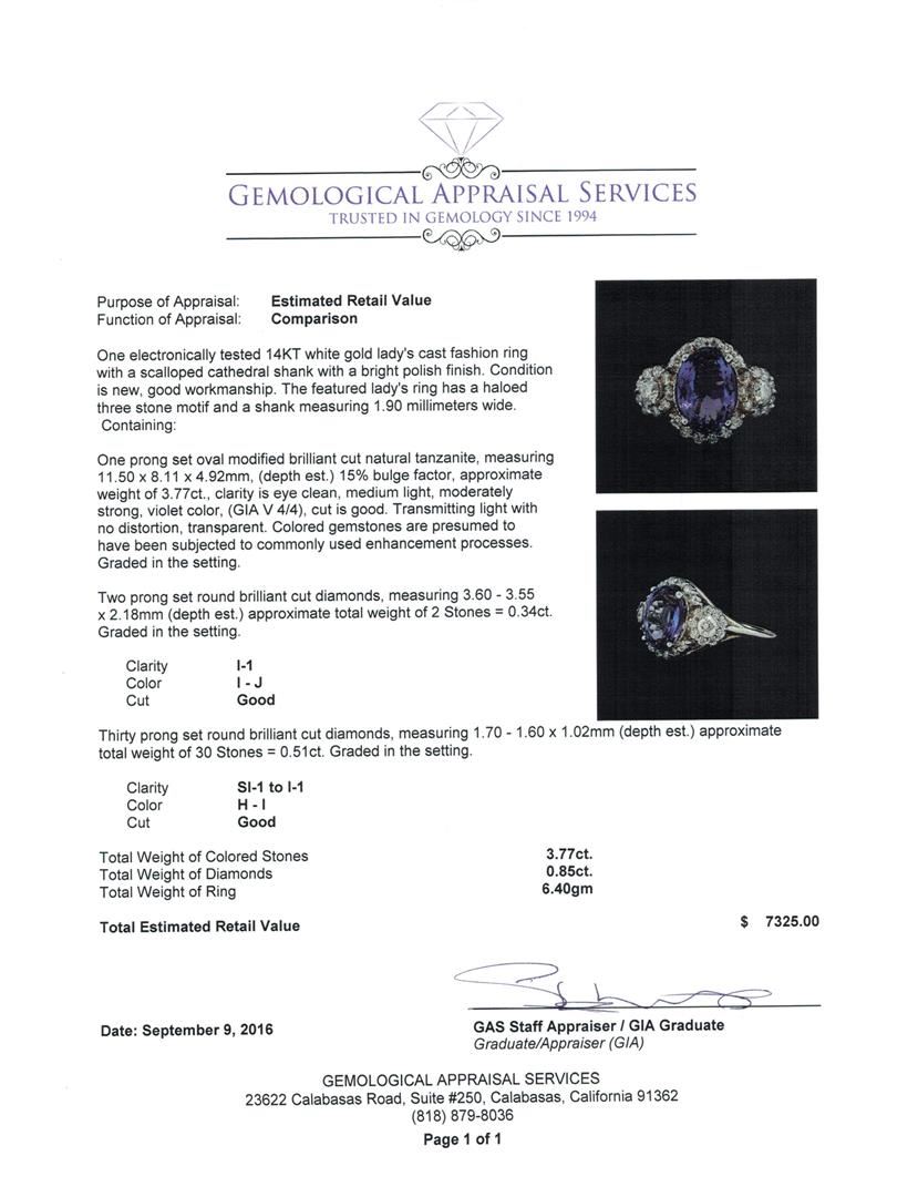 One electronically tested 14KT white gold lady's cast fashion ring with a scalloped cathedral shank with a bright polish finish. The featured lady's ring has a haloed three stone motif and a shank measuring 1.90 millimeters wide. Condition is new, good workmanship. Containing: One prong set oval modified brilliant cut natural tanzanite, measuring 11.50 x 8.11 x 4.92mm, (depth est.) 15%. bulge factor, approximate weight of 3.77ct., clarity is eye clean, medium light, moderately strong, violet color, (GIA V 4/4), cut is good. Transmitting light with no distortion, transparent. Colored gemstones are presumed to have been subjected to commonly used enhancement processes. Graded in the setting. Two prong set round brilliant cut diamonds, measuring 3.60 - 3.55 x 2.18mm (depth est.) approximate total weight of 2 Stones = 0.34ct. Graded in the setting. Clarity I-1. Color: I - J Cut Good Thirty prong set round brilliant cut diamonds, measuring 1.70 - 1.60 x 1.02mm (depth est.) approximate total weight of 30 Stones = 0.51ct. Graded in the setting. Clarity SI-1 to I-1. Color: H - I Cut Good. Total Weight of Colored Stones 3.77ct.. Total Weight of Diamonds 0.85ct.. Total Weight of Ring 6.40gm GAS Appraised at $7,325.00.