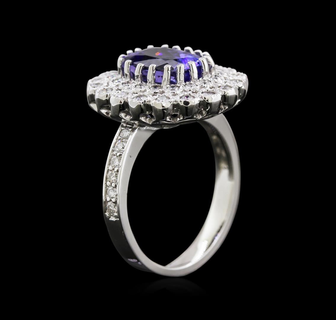 One electronically tested 14KT white gold lady's cast fashion ring with a double halo with a bright polish finish. The featured lady's ring has a shank measuring 3.00 millimeters in width. Identified with markings of "K14". Condition is new, good workmanship. Containing: One prong set rectangular cushion modified brilliant cut natural tanzanite, measuring 9.90 x 7.50 x 6.35mm, approximate weight of 3.77ct., clarity is eye clean, type I, medium, slightly grayish, bluish violet color, (GIA bV 5/2), cut is good. Transmitting light with no distortion, transparent. Colored gemstones are presumed to have been subjected to commonly used enhancement processes. Graded in the setting. Eighteen bezel set round brilliant cut diamonds, measuring 1.80 - 1.75 x 1.16mm (depth est.) approximate total weight of 18 Stones = 0.40ct. Graded in the setting. Clarity: SI-1 to I-1. Color: H - I. Cut Good Twelve prong set round brilliant cut diamonds, measuring 1.60 - 1.45 x 0.99mm (depth est.) approximate total weight of 12 Stones = 0.17ct. Graded in the setting. Clarity: SI-2 to I-1. Color: H - I. Cut Good Eighteen bezel set round brilliant cut diamonds, measuring 1.45 - 1.40 x 0.93mm (depth est.) approximate total weight of 18 Stones = 0.22ct. Graded in the setting. Clarity: SI-2 to I-1. Color: H - I. Cut Good. Total Weight of Colored Stones 3.77ct. Total Weight of Diamonds 0.79ct. Total Weight of Ring 7.70gm. GAS Appraised at $7,195.00.