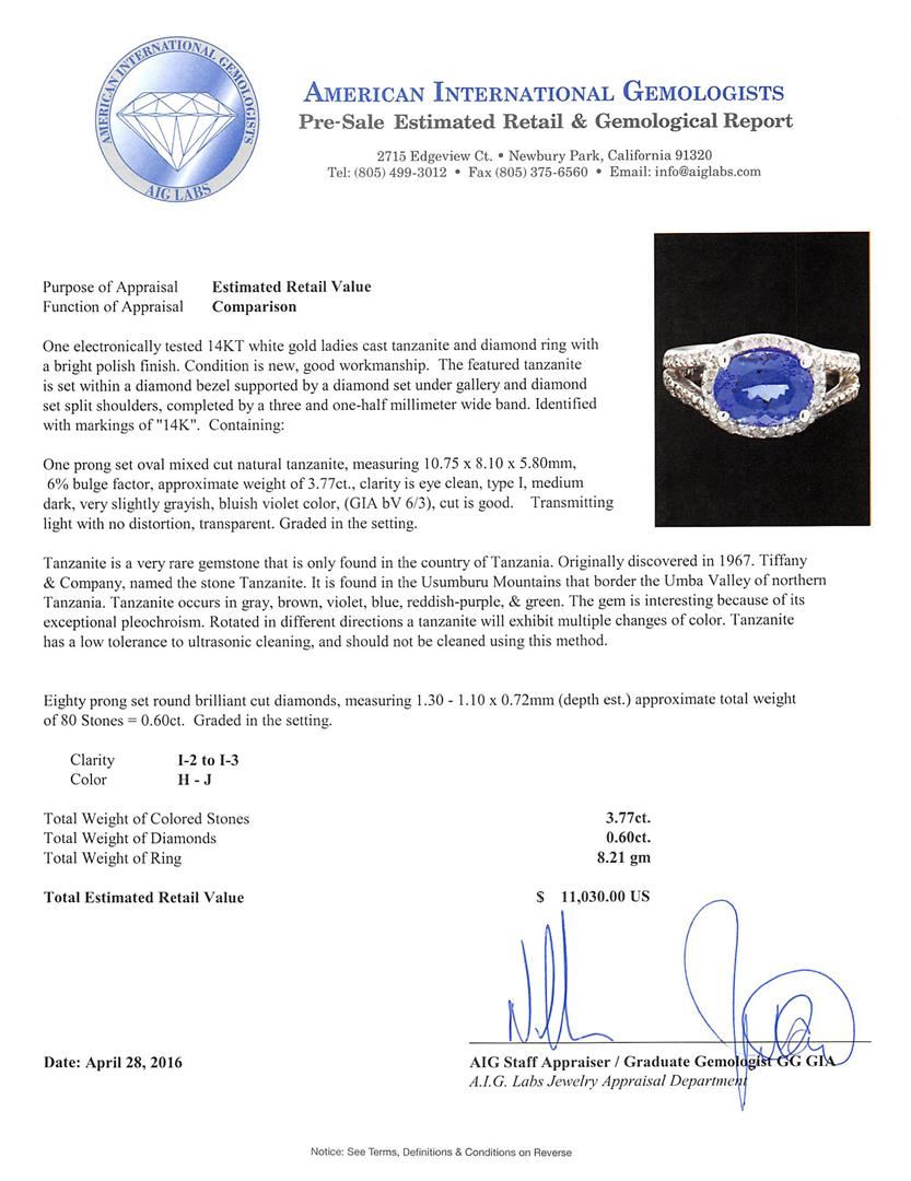 One electronically tested 14KT white gold ladies cast tanzanite and diamond ring with a bright polish finish. The featured tanzanite is set within a diamond bezel supported by a diamond set under gallery and diamond set split shoulders, completed by a three and one-half millimeter wide band. Identified with markings of "14K". Condition is new, good workmanship. Containing: One prong set oval mixed cut natural tanzanite, measuring 10.75 x 8.10 x 5.80mm, 6%. bulge factor, approximate weight of 3.77ct., clarity is eye clean, type I, medium dark, very slightly grayish, bluish violet color, (GIA bV 6/3), cut is good. Transmitting light with no distortion, transparent. Graded in the setting. Tanzanite is a very rare gemstone that is only found in the country of Tanzania. Originally discovered in 1967. Tiffany & Company, named the stone Tanzanite. It is found in the Usumburu Mountains that border the Umba Valley of northern Tanzania. Tanzanite occurs in gray, brown, violet, blue, reddish-purple, & green. The gem is interesting because of its exceptional pleochroism. Rotated in different directions a tanzanite will exhibit multiple changes of color. Tanzanite has a low tolerance to ultrasonic cleaning, and should not be cleaned using this method. Eighty prong set round brilliant cut diamonds, measuring 1.30 - 1.10 x 0.72mm (depth est.) approximate total weight of 80 Stones = 0.60ct. Graded in the setting. Clarity: I-2 to I-3. Color: H - J. Total Weight of Colored Stones 3.77ct. Total Weight of Diamonds 0.60ct. Total Weight of Ring 8.21gm. AIG Appraised at $11,030.00.