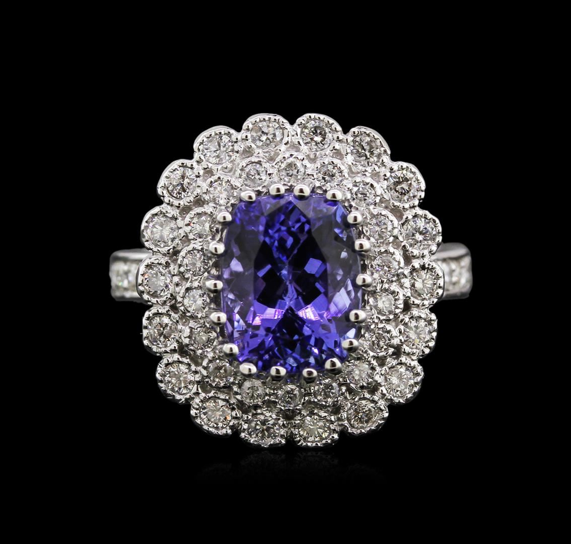 One electronically tested 14KT white gold lady's cast fashion ring with a double halo with a bright polish finish. The featured lady's ring has a shank measuring 3.00 millimeters in width. Identified with markings of "K14". Condition is new, good workmanship. Containing: One prong set rectangular cushion modified brilliant cut natural tanzanite, measuring 9.90 x 7.50 x 6.35mm, approximate weight of 3.77ct., clarity is eye clean, type I, medium, slightly grayish, bluish violet color, (GIA bV 5/2), cut is good. Transmitting light with no distortion, transparent. Colored gemstones are presumed to have been subjected to commonly used enhancement processes. Graded in the setting. Eighteen bezel set round brilliant cut diamonds, measuring 1.80 - 1.75 x 1.16mm (depth est.) approximate total weight of 18 Stones = 0.40ct. Graded in the setting. Clarity: SI-1 to I-1. Color: H - I. Cut Good Twelve prong set round brilliant cut diamonds, measuring 1.60 - 1.45 x 0.99mm (depth est.) approximate total weight of 12 Stones = 0.17ct. Graded in the setting. Clarity: SI-2 to I-1. Color: H - I. Cut Good Eighteen bezel set round brilliant cut diamonds, measuring 1.45 - 1.40 x 0.93mm (depth est.) approximate total weight of 18 Stones = 0.22ct. Graded in the setting. Clarity: SI-2 to I-1. Color: H - I. Cut Good. Total Weight of Colored Stones 3.77ct. Total Weight of Diamonds 0.79ct. Total Weight of Ring 7.70gm. GAS Appraised at $7,195.00.