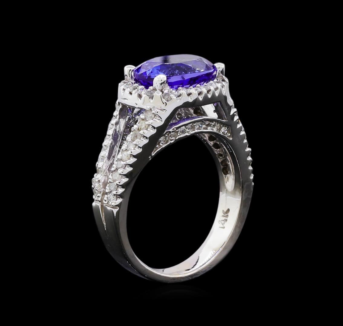 One electronically tested 14KT white gold ladies cast tanzanite and diamond ring with a bright polish finish. The featured tanzanite is set within a diamond bezel supported by a diamond set under gallery and diamond set split shoulders, completed by a three and one-half millimeter wide band. Identified with markings of "14K". Condition is new, good workmanship. Containing: One prong set oval mixed cut natural tanzanite, measuring 10.75 x 8.10 x 5.80mm, 6%. bulge factor, approximate weight of 3.77ct., clarity is eye clean, type I, medium dark, very slightly grayish, bluish violet color, (GIA bV 6/3), cut is good. Transmitting light with no distortion, transparent. Graded in the setting. Tanzanite is a very rare gemstone that is only found in the country of Tanzania. Originally discovered in 1967. Tiffany & Company, named the stone Tanzanite. It is found in the Usumburu Mountains that border the Umba Valley of northern Tanzania. Tanzanite occurs in gray, brown, violet, blue, reddish-purple, & green. The gem is interesting because of its exceptional pleochroism. Rotated in different directions a tanzanite will exhibit multiple changes of color. Tanzanite has a low tolerance to ultrasonic cleaning, and should not be cleaned using this method. Eighty prong set round brilliant cut diamonds, measuring 1.30 - 1.10 x 0.72mm (depth est.) approximate total weight of 80 Stones = 0.60 ct. Graded in the setting. Clarity: I-2 to I-3. Color: H - J. Total Weight of Colored Stones 3.77ct. Total Weight of Diamonds 0.60 ct. Total Weight of Ring 8.21gm.