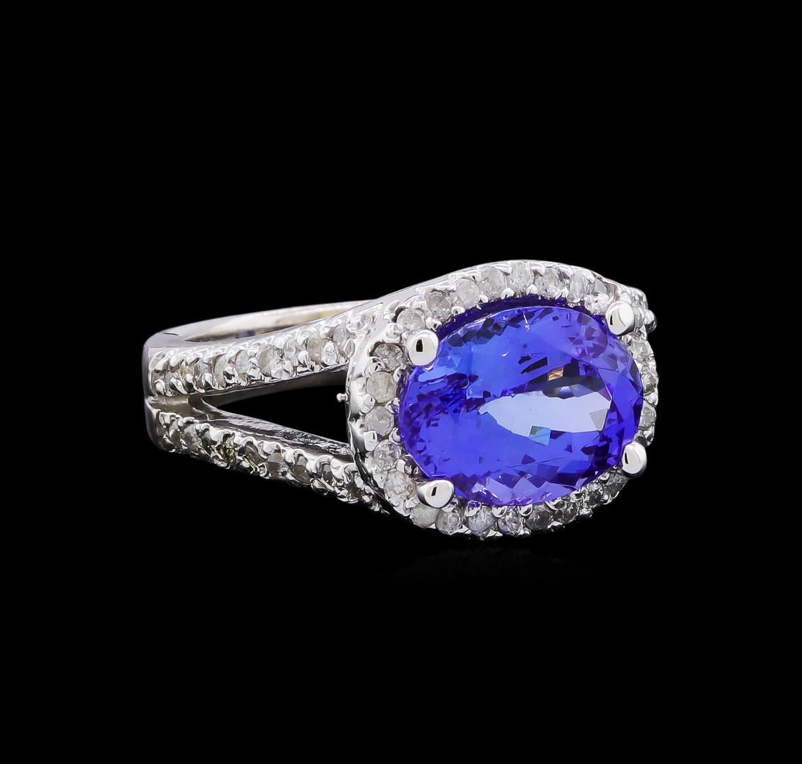 One electronically tested 14KT white gold ladies cast tanzanite and diamond ring with a bright polish finish. The featured tanzanite is set within a diamond bezel supported by a diamond set under gallery and diamond set split shoulders, completed by a three and one-half millimeter wide band. Identified with markings of "14K". Condition is new, good workmanship. Containing: One prong set oval mixed cut natural tanzanite, measuring 10.75 x 8.10 x 5.80mm, 6%. bulge factor, approximate weight of 3.77ct., clarity is eye clean, type I, medium dark, very slightly grayish, bluish violet color, (GIA bV 6/3), cut is good. Transmitting light with no distortion, transparent. Graded in the setting. Tanzanite is a very rare gemstone that is only found in the country of Tanzania. Originally discovered in 1967. Tiffany & Company, named the stone Tanzanite. It is found in the Usumburu Mountains that border the Umba Valley of northern Tanzania. Tanzanite occurs in gray, brown, violet, blue, reddish-purple, & green. The gem is interesting because of its exceptional pleochroism. Rotated in different directions a tanzanite will exhibit multiple changes of color. Tanzanite has a low tolerance to ultrasonic cleaning, and should not be cleaned using this method. Eighty prong set round brilliant cut diamonds, measuring 1.30 - 1.10 x 0.72mm (depth est.) approximate total weight of 80 Stones = 0.60 ct. Graded in the setting. Clarity: I-2 to I-3. Color: H - J. Total Weight of Colored Stones 3.77ct. Total Weight of Diamonds 0.60 ct. Total Weight of Ring 8.21gm.
