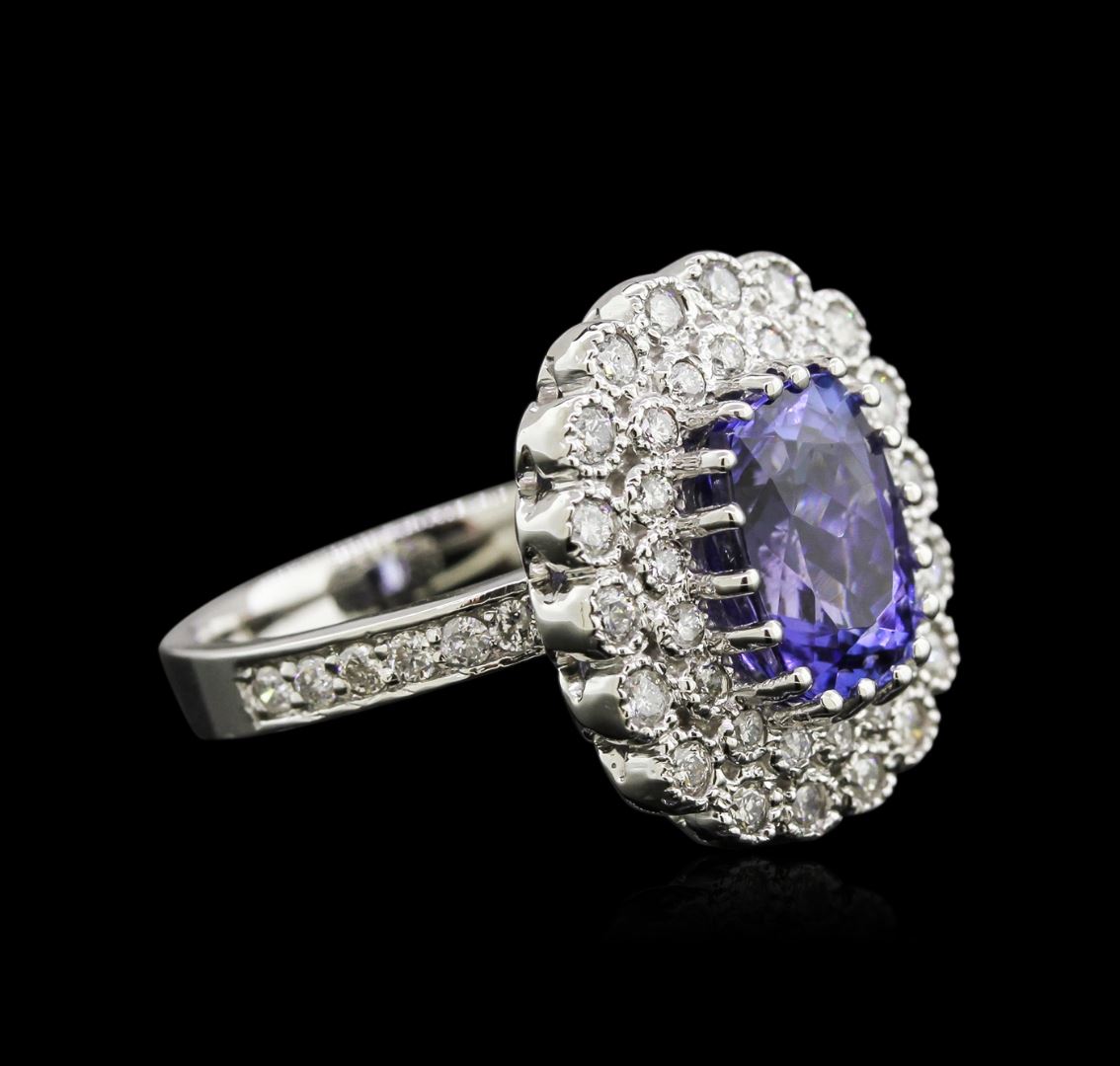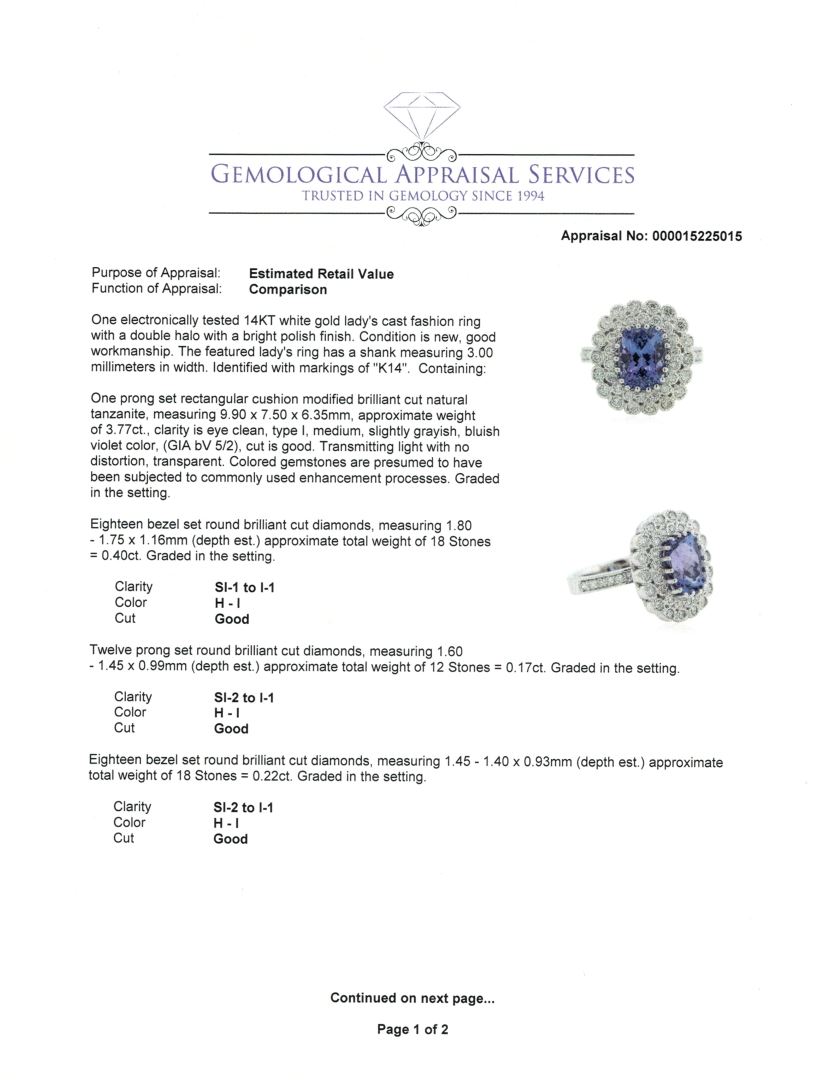 One electronically tested 14KT white gold lady's cast fashion ring with a double halo with a bright polish finish. The featured lady's ring has a shank measuring 3.00 millimeters in width. Identified with markings of "K14". Condition is new, good workmanship. Containing: One prong set rectangular cushion modified brilliant cut natural tanzanite, measuring 9.90 x 7.50 x 6.35mm, approximate weight of 3.77ct., clarity is eye clean, type I, medium, slightly grayish, bluish violet color, (GIA bV 5/2), cut is good. Transmitting light with no distortion, transparent. Colored gemstones are presumed to have been subjected to commonly used enhancement processes. Graded in the setting. Eighteen bezel set round brilliant cut diamonds, measuring 1.80 - 1.75 x 1.16mm (depth est.) approximate total weight of 18 Stones = 0.40ct. Graded in the setting. Clarity: SI-1 to I-1. Color: H - I. Cut Good Twelve prong set round brilliant cut diamonds, measuring 1.60 - 1.45 x 0.99mm (depth est.) approximate total weight of 12 Stones = 0.17ct. Graded in the setting. Clarity: SI-2 to I-1. Color: H - I. Cut Good Eighteen bezel set round brilliant cut diamonds, measuring 1.45 - 1.40 x 0.93mm (depth est.) approximate total weight of 18 Stones = 0.22ct. Graded in the setting. Clarity: SI-2 to I-1. Color: H - I. Cut Good. Total Weight of Colored Stones 3.77ct. Total Weight of Diamonds 0.79ct. Total Weight of Ring 7.70gm. GAS Appraised at $7,195.00.