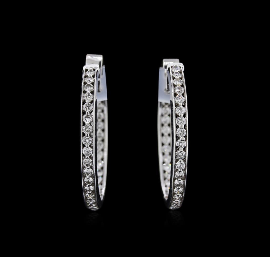 One pair electronically tested 14KT white gold ladies cast diamond hoop earrings with hinged clip backs with a bright polish finish. Measurements: 1.50" in diameter. Condition is very good. Containing: Sixty-Six prong set round brilliant cut diamonds, measuring 2.50 - 2.50 x 1.50mm (depth est.) approximate total weight of 66 Stones = 3.77ct. Clarity: SI-1 to SI-2. Color: H - I, Cut is Good. Diamonds are graded in the mounting, unless otherwise stated. Total Weight of Diamonds 3.77ct. Total Weight of Hoop Earrings 18.50 grams. GGL Appraised at $7,000.00.