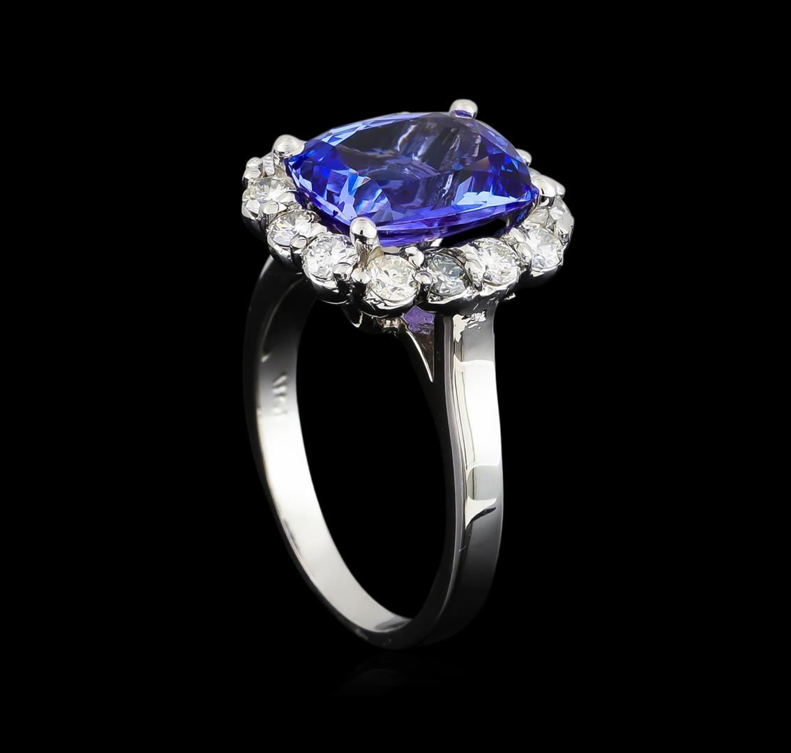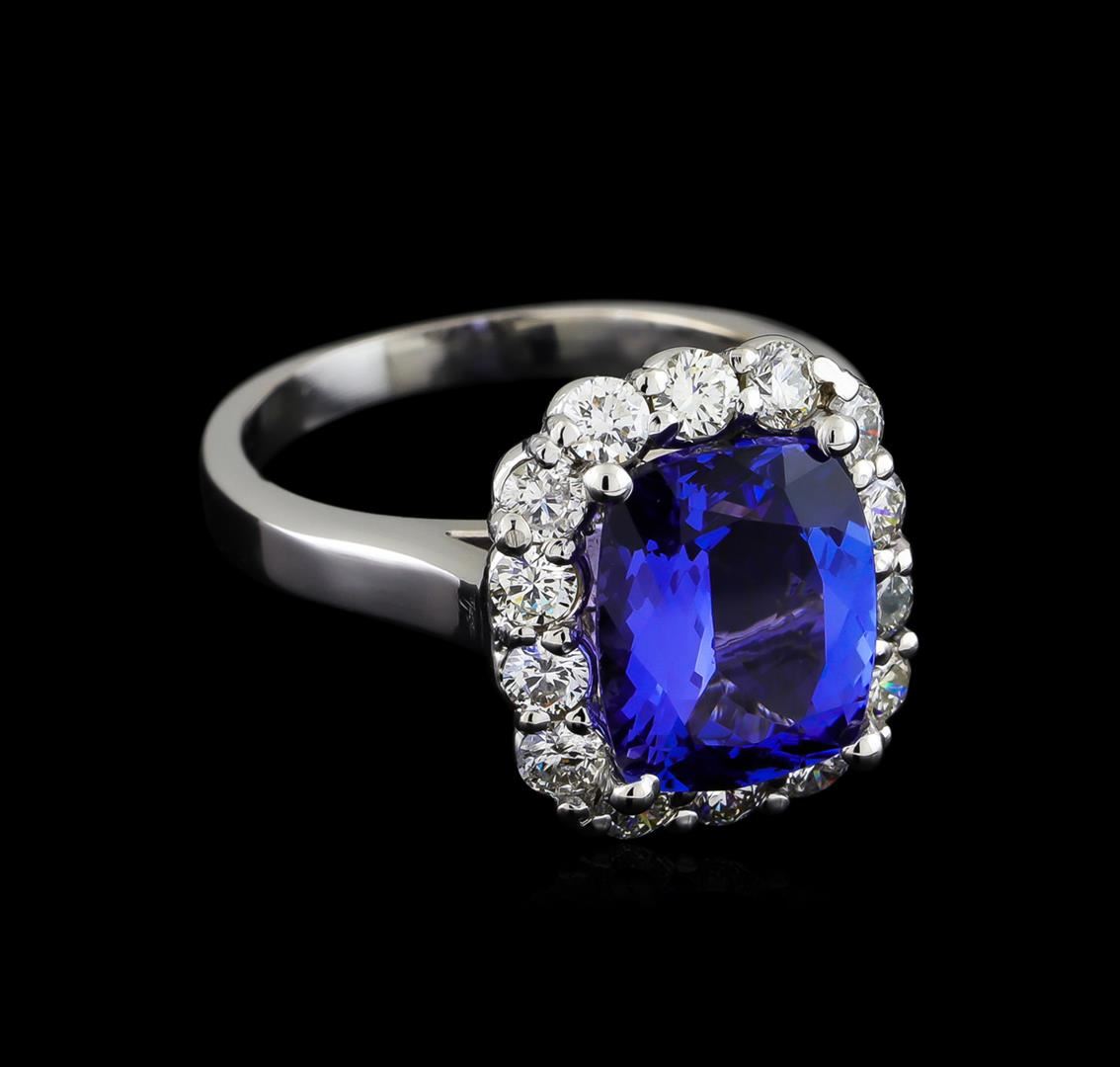 One electronically tested 14KT white gold ladies cast tanzanite and diamond ring with a bright polish finish. The featured tanzanite is set within a diamond bezel, completed by a two millimeter wide band. Identified with markings of "14K". Condition is new, good workmanship. Containing: One prong set rectangular cushion mixed cut natural tanzanite, measuring 10.60 x 8.70 x 5.00mm, 4%. bulge factor, approximate weight of 3.78ct., clarity is eye clean, type I, medium dark, very slightly grayish, bluish violet color, (GIA bV 6/3), cut is good. Transmitting light with no distortion, transparent. Graded in the setting. Tanzanite is a very rare gemstone that is only found in the country of Tanzania. Originally discovered in 1967. Tiffany & Company, named the stone Tanzanite. It is found in the Usumburu Mountains that border the Umba Valley of northern Tanzania. Tanzanite occurs in gray, brown, violet, blue, reddish-purple, & green. The gem is interesting because of its exceptional pleochroism. Rotated in different directions a tanzanite will exhibit multiple changes of color. Tanzanite has a low tolerance to ultrasonic cleaning, and should not be cleaned using this method. Fourteen prong set round brilliant cut diamonds, measuring 2.50 - 2.50 x 1.50mm (depth est.) approximate. Total Weight of 14 Stones = 0.85ct. The clarity grade reflects the entire range of clarity for this group. Graded in the setting. Clarity: SI-1 to I-2. Color: G - H. Total Weight of Colored Stones 3.78ct. Total Weight of Diamonds 0.85ct. Total Weight of Ring 6.00gm. AIG Appraised at $11,250.00.