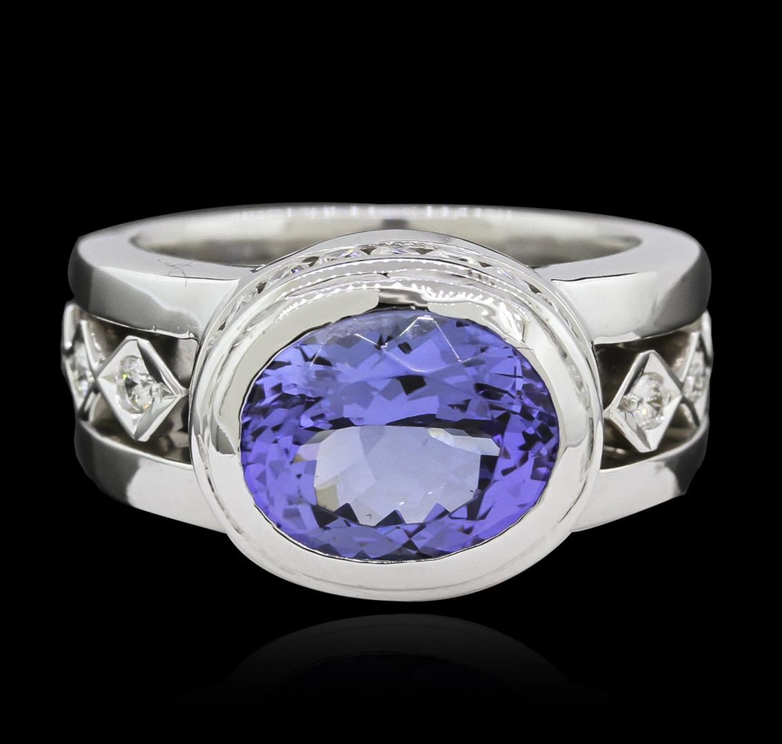 One electronically tested 18KT white gold lady's combination cast & assembled fashion ring with a three row wide band with a bright polish finish. The featured lady's ring has a triple shank measuring 7.00 millimeters wide. Identified with markings of "18K". Condition is new, good workmanship. Containing: One bezel set oval modified brilliant cut natural tanzanite, measuring 10.80 x 8.90 x 5.61mm, approximate weight of 3.78ct., clarity is eye clean, type I, medium, very slightly grayish, bluish violet color, (GIA bV 5/3), cut is very good. Transmitting light with no distortion, transparent. Colored gemstones are presumed to have been subjected to commonly used enhancement processes. Graded in the setting. Twenty channel set round brilliant cut diamonds, measuring 2.00 - 1.90 x 1.23mm (depth est.) approximate total weight of 20 Stones = 0.58ct. Graded in the setting. Clarity: VS-2 to SI-1. Color: H - I. Cut Very Good Six prong set round brilliant cut diamonds, measuring 2.00 - 1.90 x 1.23mm (depth est.) approximate total weight of 6 Stones = 0.17ct. Graded in the setting. Clarity: VS-2 to SI-1. Color: H - I. Cut Very Good. Total Weight of Colored Stones 3.78ct. Total Weight of Diamonds 0.75ct. Total Weight of Ring 18.20gm. GAS Appraised at $10,970.00.