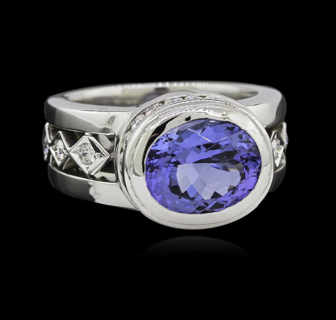 One electronically tested 18KT white gold lady's combination cast & assembled fashion ring with a three row wide band with a bright polish finish. The featured lady's ring has a triple shank measuring 7.00 millimeters wide. Identified with markings of "18K". Condition is new, good workmanship. Containing: One bezel set oval modified brilliant cut natural tanzanite, measuring 10.80 x 8.90 x 5.61mm, approximate weight of 3.78ct., clarity is eye clean, type I, medium, very slightly grayish, bluish violet color, (GIA bV 5/3), cut is very good. Transmitting light with no distortion, transparent. Colored gemstones are presumed to have been subjected to commonly used enhancement processes. Graded in the setting. Twenty channel set round brilliant cut diamonds, measuring 2.00 - 1.90 x 1.23mm (depth est.) approximate total weight of 20 Stones = 0.58ct. Graded in the setting. Clarity: VS-2 to SI-1. Color: H - I. Cut Very Good Six prong set round brilliant cut diamonds, measuring 2.00 - 1.90 x 1.23mm (depth est.) approximate total weight of 6 Stones = 0.17ct. Graded in the setting. Clarity: VS-2 to SI-1. Color: H - I. Cut Very Good. Total Weight of Colored Stones 3.78ct. Total Weight of Diamonds 0.75ct. Total Weight of Ring 18.20gm. GAS Appraised at $10,970.00.