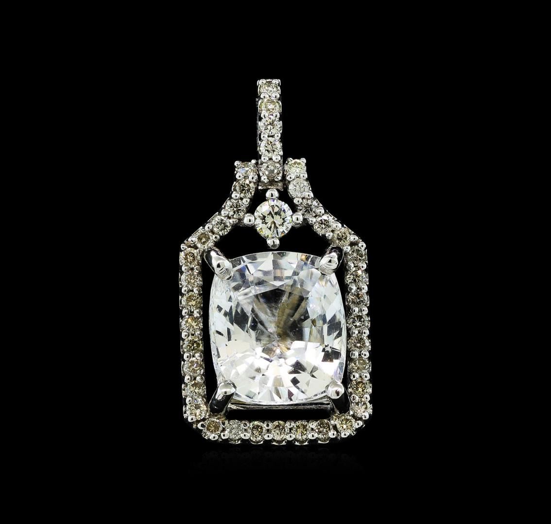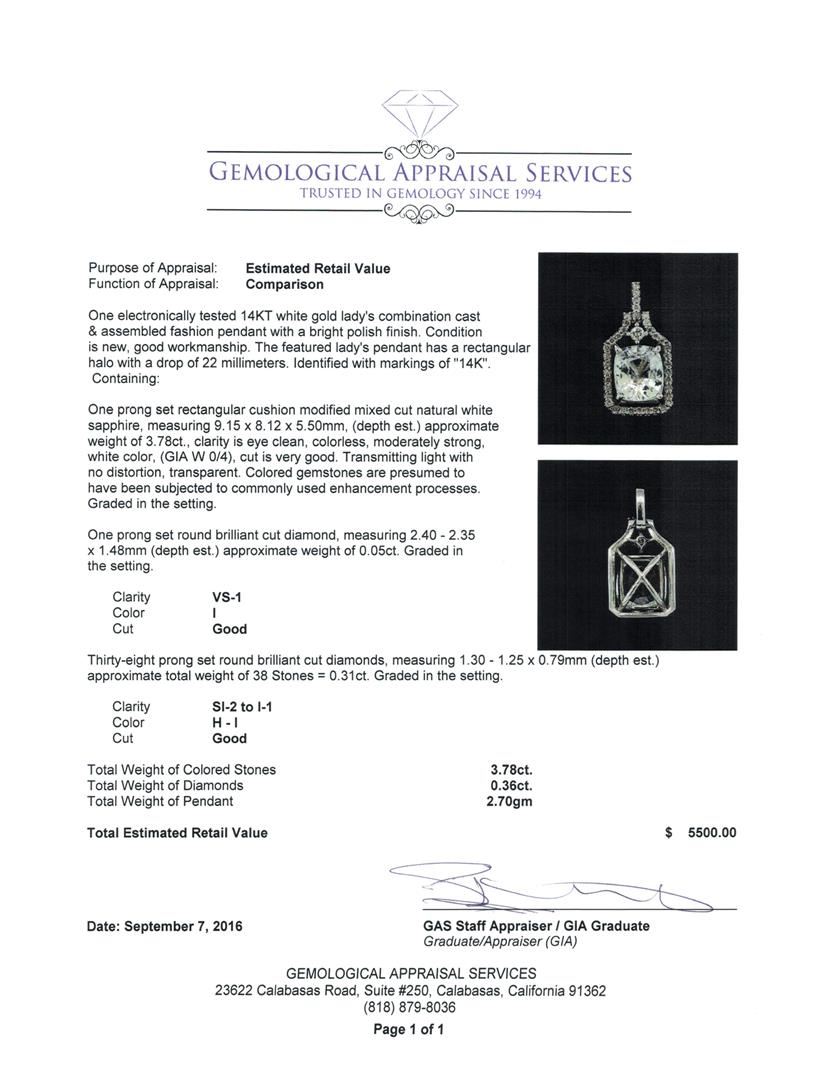 One electronically tested 14KT white gold lady's combination cast & assembled fashion pendant with a bright polish finish. The featured lady's pendant has a rectangular halo with a drop of 22 millimeters. Identified with markings of '14K'. Condition is new, good workmanship. Containing: One prong set rectangular cushion modified mixed cut natural white sapphire, measuring 9.15 x 8.12 x 5.50mm, (depth est.) approximate weight of 3.78ct., clarity is eye clean, colorless, moderately strong, white color, (GIA W 0/4), cut is very good. Transmitting light with no distortion, transparent. Colored gemstones are presumed to have been subjected to commonly used enhancement processes. Graded in the setting. One prong set round brilliant cut diamond, measuring 2.40 - 2.35 x 1.48mm (depth est.) approximate weight of 0.05ct. Graded in the setting. Clarity VS-1. Color: I Cut Good Thirty-Eight prong set round brilliant cut diamonds, measuring 1.30 - 1.25 x 0.79mm (depth est.) approximate total weight of 38 Stones = 0.31ct. Graded in the setting. Clarity SI-2 to I-1. Color: H - I Cut Good. Total Weight of Colored Stones 3.78ct.. Total Weight of Diamonds 0.36ct.. Total Weight of Pendant 2.70gm GAS Appraised at $5,500.00.