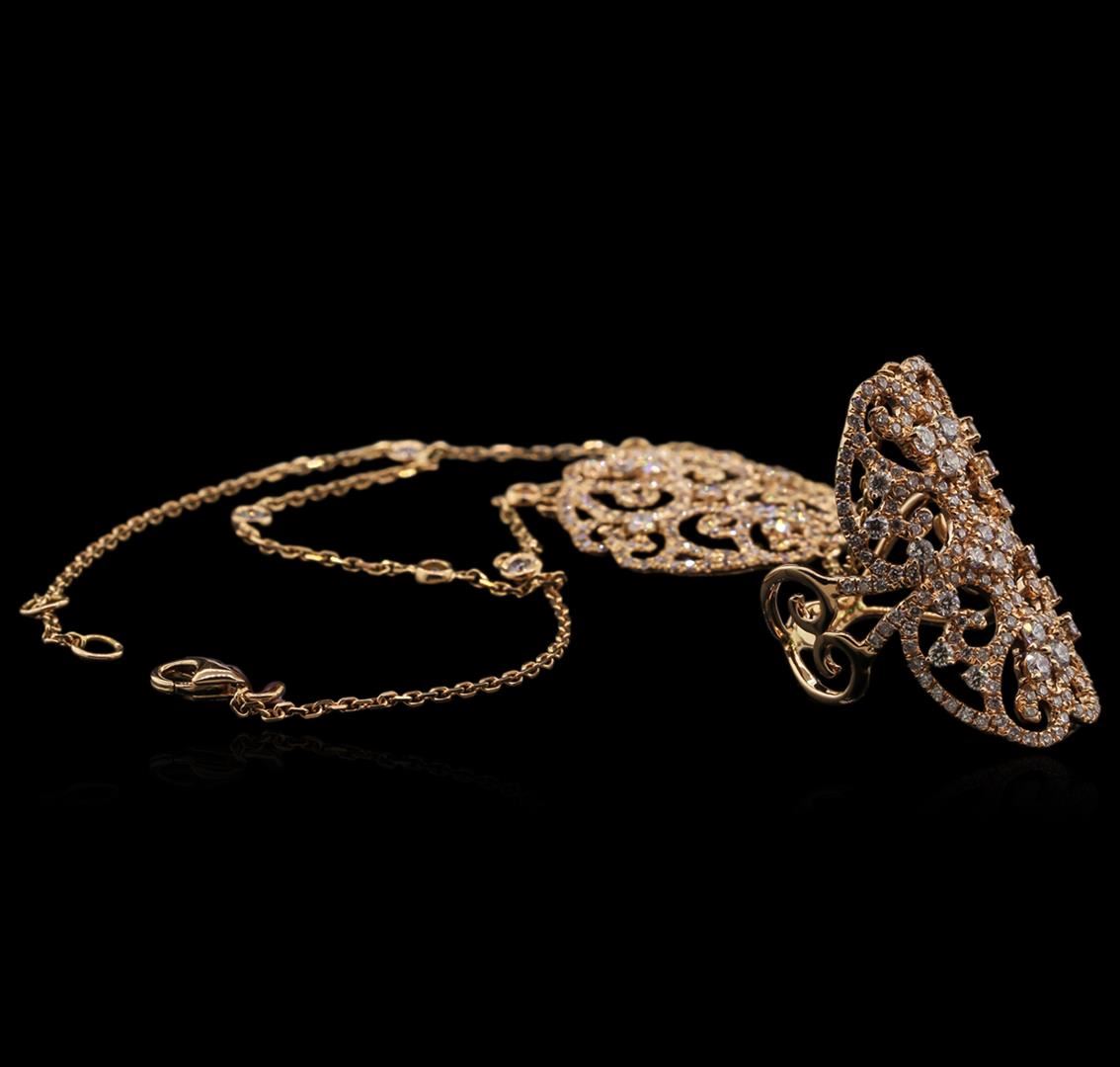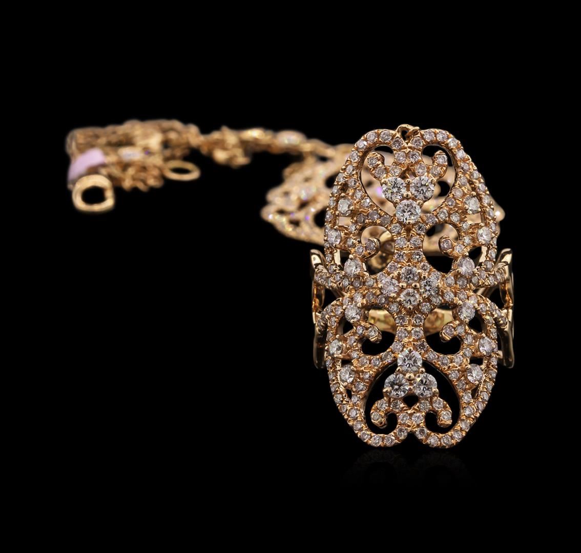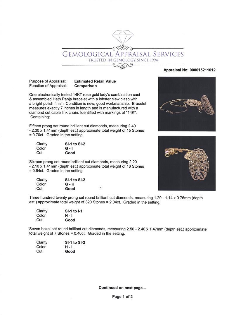 One electronically tested 14KT rose gold lady's combination cast & assembled Hath Panja bracelet with a lobster claw clasp with a bright polish finish. Bracelet measures exactly 7 inches in length and is manufactured with a diamond cut cable link chain. Identified with markings of "14K". Condition is new, good workmanship. Containing: Fifteen prong set round brilliant cut diamonds, measuring 2.40 - 2.30 x 1.41mm (depth est.) approximate. Total Weight of 15 Stones = 0.70ct. Graded in the setting. Clarity: SI-1 to SI-2. Color: G - I. Cut Good Sixteen prong set round brilliant cut diamonds, measuring 2.20 - 2.10 x 1.41mm (depth est.) approximate. Total Weight of 16 Stones = 0.64ct. Graded in the setting. Clarity: SI-1 to SI-2. Color: G - Good Three Hundred Twenty prong set round brilliant cut diamonds, measuring 1.20 - 1.14 x 0.76mm (depth est.) approximate. Total Weight of 320 Stones = 2.04ct. Graded in the setting. Clarity: SI-1 to I-1. Color: H - I. Cut Good Seven bezel set round brilliant cut diamonds, measuring 2.50 - 2.40 x 1.47mm (depth est.) approximate. Total Weight of 7 Stones = 0.40ct. Graded in the setting. Clarity: SI-1 to SI-2. Color: H - I. Cut Good. Total Weight of Diamonds 3.78ct. Total Weight of Bracelet 13.50gm. GAS Appraised at $20,465.00.