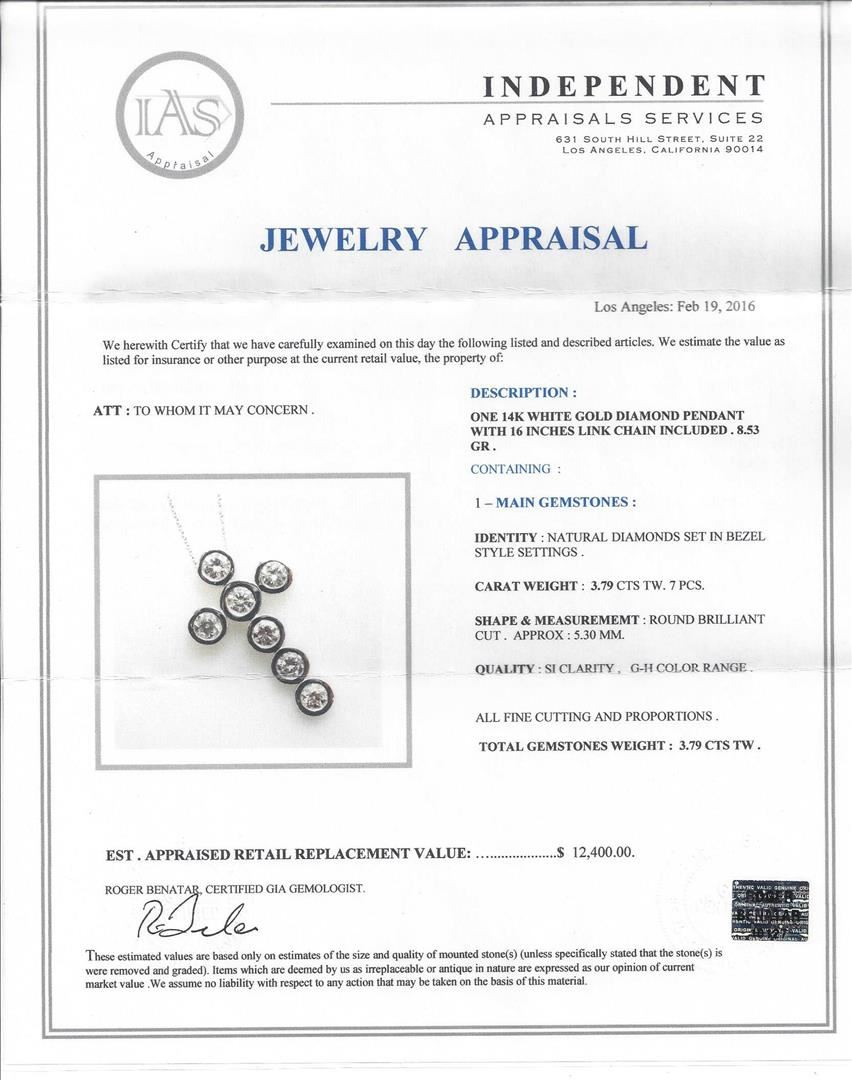 One 14K white gold diamond pendant with 16 inches link chain included. 8.53 GR. Containing: Main gemstones: Identity: Natural diamonds set in bezel style settings. Carat weight: 3.79 CTS TW. 7 PCS. Shape and measurement: Round brilliant cut. Approx. : 5.30 mm. Quality: SI clarity, G-H color range. All fine cutting and proportions. Total gemstones weight : 3.79 CTS TW.