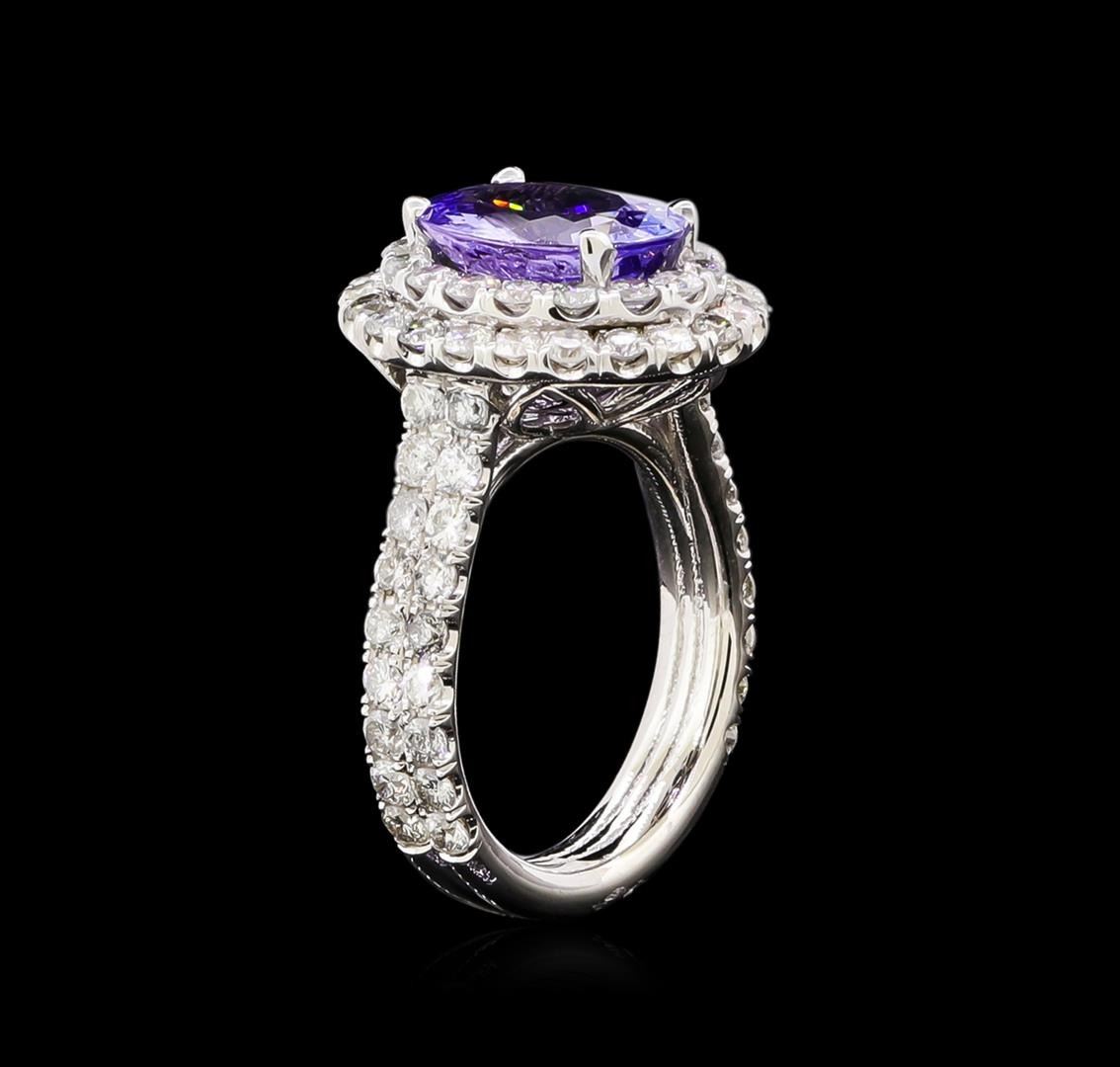 One electronically tested 14KT white gold ladies cast tanzanite and diamond ring with a bright polish finish. The featured tanzanite is set within tiered diamond bezels supported by a tuliped under gallery and diamond ribbon shoulders, completed by a four millimeter wide band. Identified with markings of "14K". Condition is new, good workmanship. Containing: One prong set oval mixed cut natural tanzanite, measuring 11.00 x 8.90 x 5.50mm, approximate weight of 3.79ct., clarity is eye clean, type I, medium, very slightly grayish, violet color, (GIA V 5/3), cut is good. Transmitting light with no distortion, transparent. Graded in the setting. Tanzanite is a very rare gemstone that is only found in the country of Tanzania. Originally discovered in 1967. Tiffany & Company, named the stone Tanzanite. It is found in the Usumburu Mountains that border the Umba Valley of northern Tanzania. Tanzanite occurs in gray, brown, violet, blue, reddish-purple, & green. The gem is interesting because of its exceptional pleochroism. Rotated in different directions a tanzanite will exhibit multiple changes of color. Tanzanite has a low tolerance to ultrasonic cleaning, and should not be cleaned using this method. Seventy-Four prong set round brilliant cut diamonds, measuring 2.00 - 1.90 x 1.17mm (depth est.) approximate total weight of 74 Stones = 2.10ct. Graded in the setting. Clarity: SI-2 to I-2. Color: G - I. Total Weight of Colored Stones 3.79ct. Total Weight of Diamonds 2.10ct. Total Weight of Ring 7.81gm. AIG Appraised at $12,520.00.