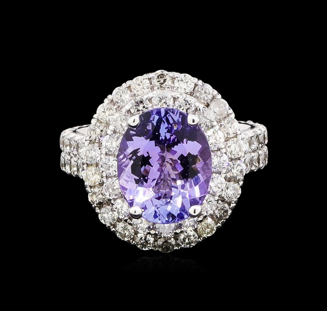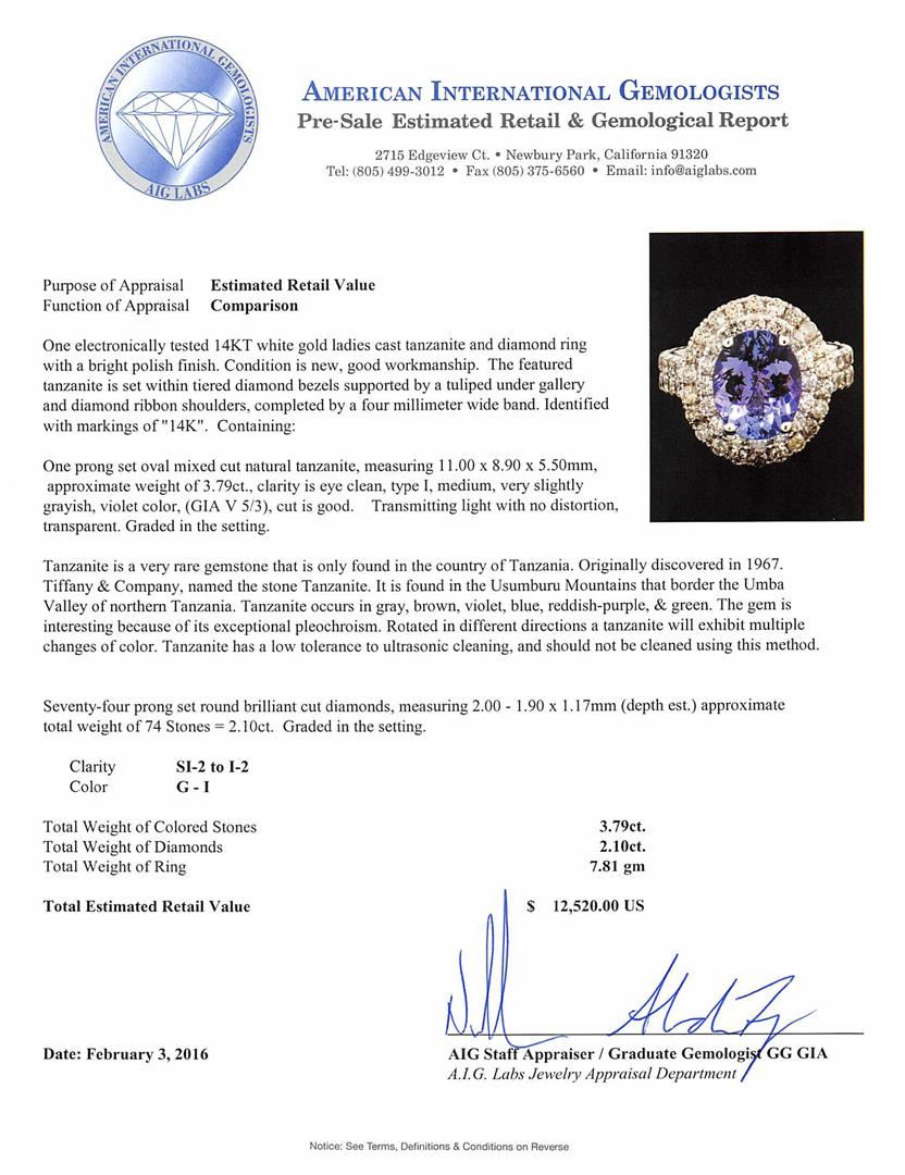 One electronically tested 14KT white gold ladies cast tanzanite and diamond ring with a bright polish finish. The featured tanzanite is set within tiered diamond bezels supported by a tuliped under gallery and diamond ribbon shoulders, completed by a four millimeter wide band. Identified with markings of "14K". Condition is new, good workmanship. Containing: One prong set oval mixed cut natural tanzanite, measuring 11.00 x 8.90 x 5.50mm, approximate weight of 3.79ct., clarity is eye clean, type I, medium, very slightly grayish, violet color, (GIA V 5/3), cut is good. Transmitting light with no distortion, transparent. Graded in the setting. Tanzanite is a very rare gemstone that is only found in the country of Tanzania. Originally discovered in 1967. Tiffany & Company, named the stone Tanzanite. It is found in the Usumburu Mountains that border the Umba Valley of northern Tanzania. Tanzanite occurs in gray, brown, violet, blue, reddish-purple, & green. The gem is interesting because of its exceptional pleochroism. Rotated in different directions a tanzanite will exhibit multiple changes of color. Tanzanite has a low tolerance to ultrasonic cleaning, and should not be cleaned using this method. Seventy-Four prong set round brilliant cut diamonds, measuring 2.00 - 1.90 x 1.17mm (depth est.) approximate total weight of 74 Stones = 2.10ct. Graded in the setting. Clarity: SI-2 to I-2. Color: G - I. Total Weight of Colored Stones 3.79ct. Total Weight of Diamonds 2.10ct. Total Weight of Ring 7.81gm. AIG Appraised at $12,520.00.