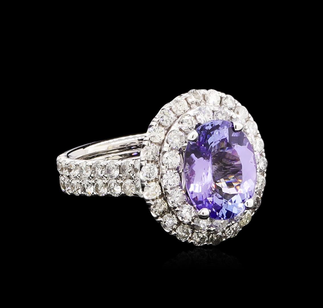 One electronically tested 14KT white gold ladies cast tanzanite and diamond ring with a bright polish finish. The featured tanzanite is set within tiered diamond bezels supported by a tuliped under gallery and diamond ribbon shoulders, completed by a four millimeter wide band. Identified with markings of "14K". Condition is new, good workmanship. Containing: One prong set oval mixed cut natural tanzanite, measuring 11.00 x 8.90 x 5.50mm, approximate weight of 3.79ct., clarity is eye clean, type I, medium, very slightly grayish, violet color, (GIA V 5/3), cut is good. Transmitting light with no distortion, transparent. Graded in the setting. Tanzanite is a very rare gemstone that is only found in the country of Tanzania. Originally discovered in 1967. Tiffany & Company, named the stone Tanzanite. It is found in the Usumburu Mountains that border the Umba Valley of northern Tanzania. Tanzanite occurs in gray, brown, violet, blue, reddish-purple, & green. The gem is interesting because of its exceptional pleochroism. Rotated in different directions a tanzanite will exhibit multiple changes of color. Tanzanite has a low tolerance to ultrasonic cleaning, and should not be cleaned using this method. Seventy-Four prong set round brilliant cut diamonds, measuring 2.00 - 1.90 x 1.17mm (depth est.) approximate total weight of 74 Stones = 2.10ct. Graded in the setting. Clarity: SI-2 to I-2. Color: G - I. Total Weight of Colored Stones 3.79ct. Total Weight of Diamonds 2.10ct. Total Weight of Ring 7.81gm. AIG Appraised at $12,520.00.
