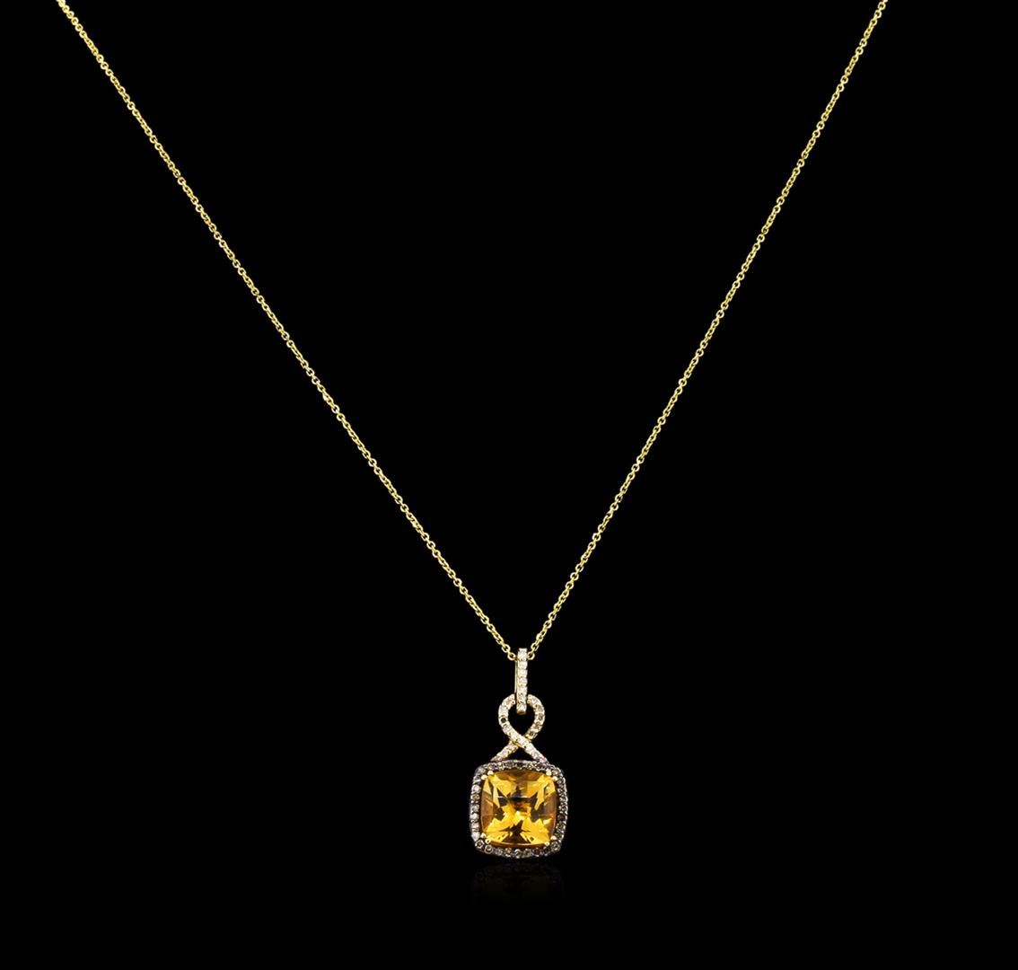 One pendant with chain featuring: 14KT yellow gold weighing 6.50 grams containing one citrine with a total weight of 3.80ct and white and brown diamonds with a total weight of 0.36ct.