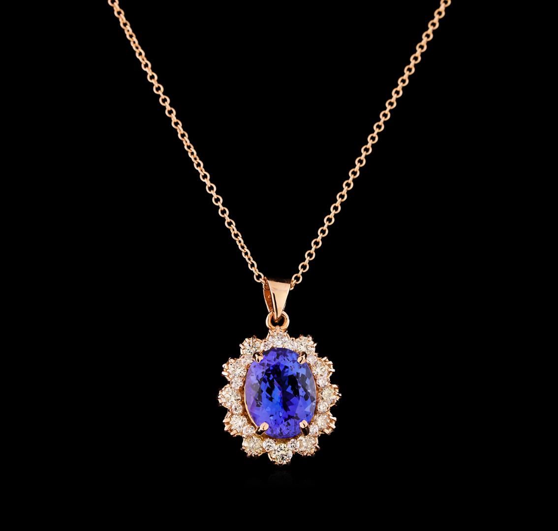 One electronically tested 14KT rose gold lady's combination cast & assembled fashion pendant & chain 18.0' long, 1.3mm round cable link with a lobster claw clasp with a bright polish finish. The featured lady's pendant and chain has a drop measuring 24 millimeters in length. Identified with markings of '14K'. Condition is new, good workmanship. Containing: One prong set oval modified brilliant cut natural tanzanite, measuring 10.93 x 8.56 x 5.71mm, (depth est.) approximate weight of 3.80ct., clarity is eye clean, medium, moderately strong, bluish violet color, (GIA bV 5/4), cut is very good. Transmitting light with no distortion, transparent. Colored gemstones are presumed to have been subjected to commonly used enhancement processes. Graded in the setting. Twelve prong set round brilliant cut diamonds, measuring 2.50 - 2.40 x 1.51mm (depth est.) approximate total weight of 12 Stones = 0.65ct. Graded in the setting. Clarity SI-1 to I-1. Color: I - J Cut Good Twelve prong set round brilliant cut diamonds, measuring 1.50 - 1.45 x 0.92mm (depth est.) approximate total weight of 12 Stones = 0.15ct. Graded in the setting. Clarity SI-1 to SI-2. Color: H - I Cut Good. Total Weight of Colored Stones 3.80ct.. Total Weight of Diamonds 0.80ct.. Total Weight of Pendant & Chain 5.50gm. GAS Appraised at $8,370.00.