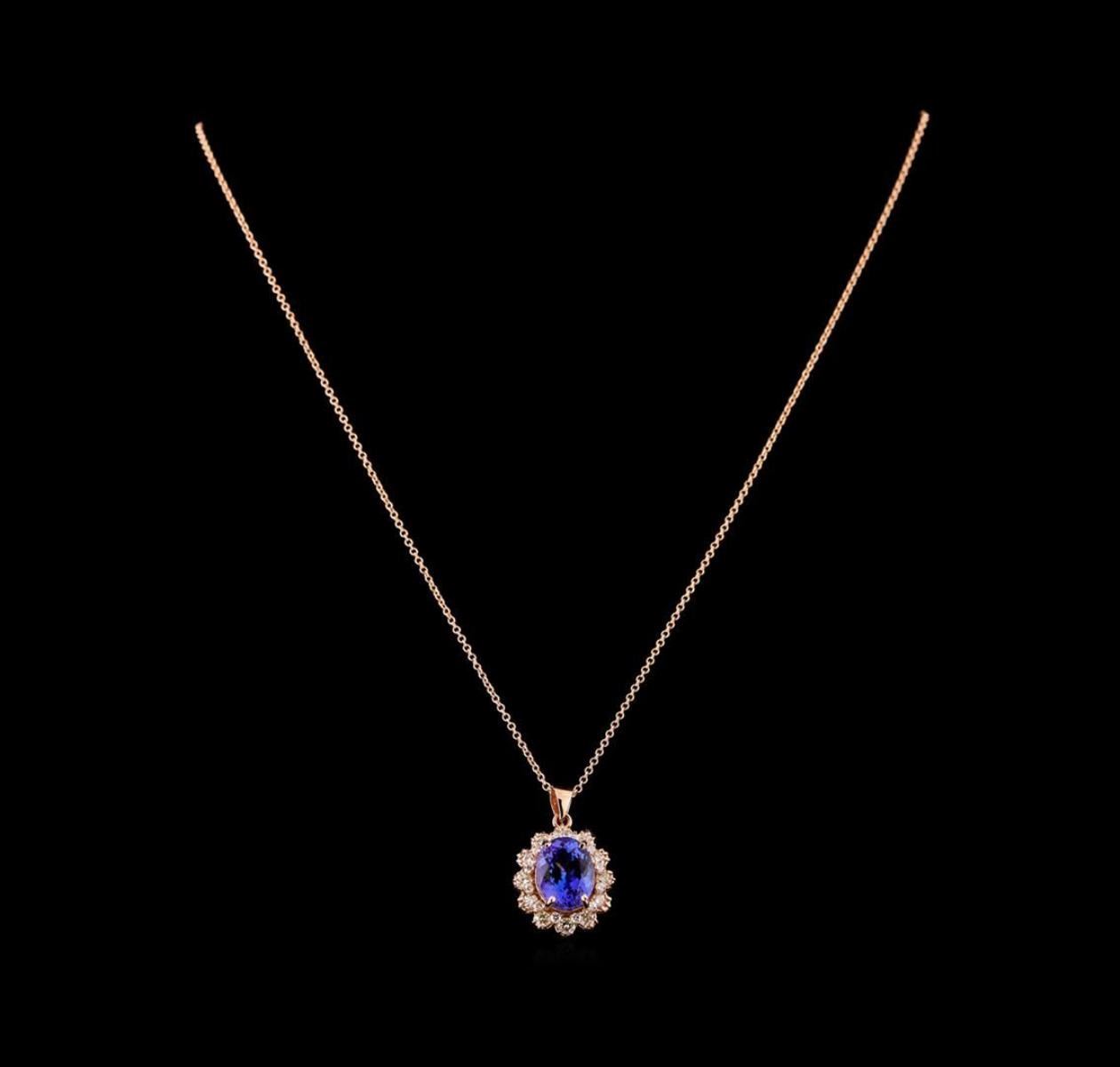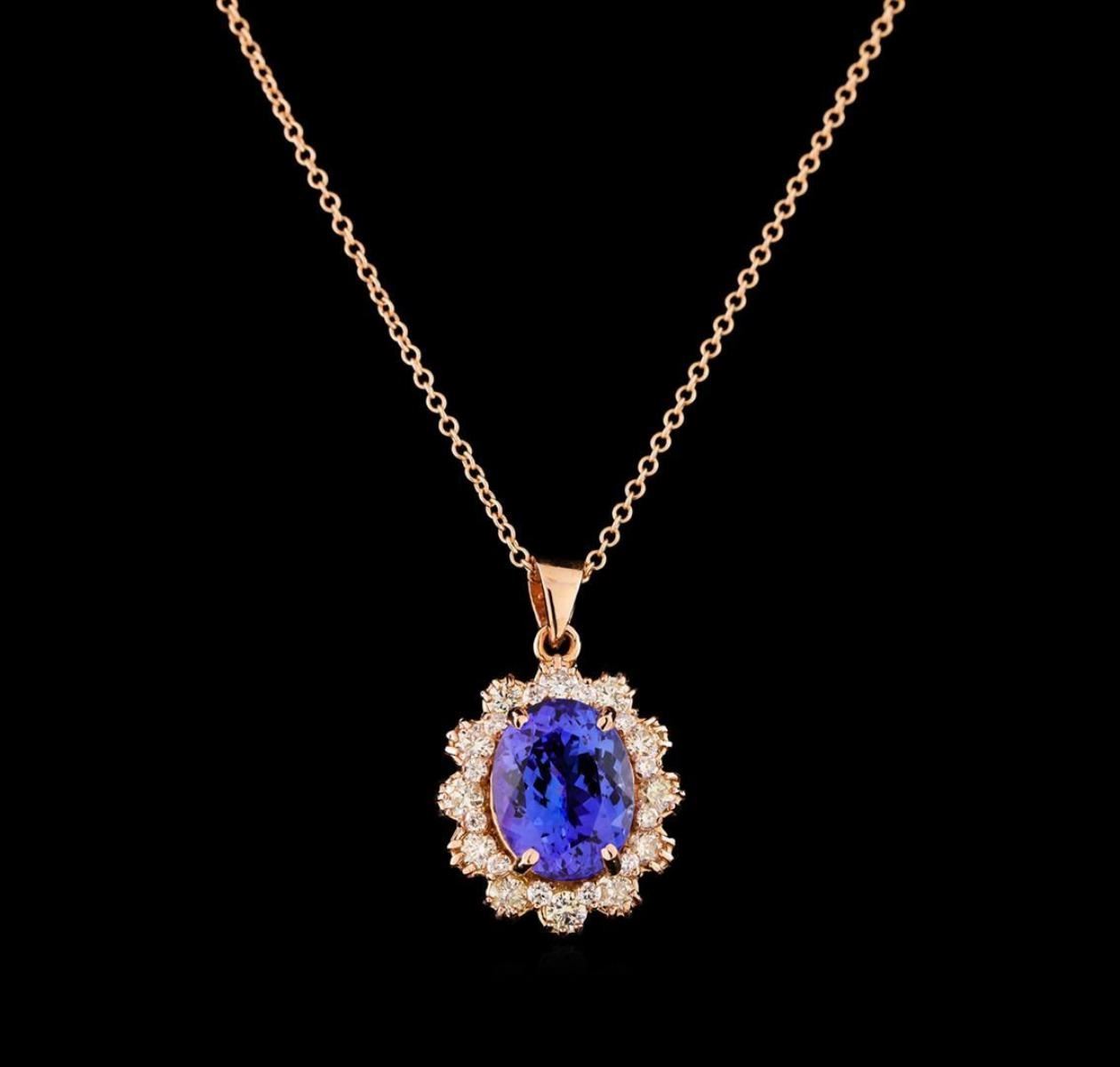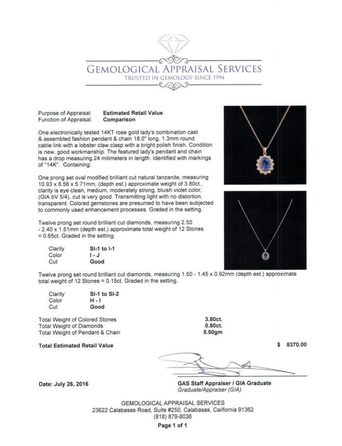 One electronically tested 14KT rose gold lady's combination cast & assembled fashion pendant & chain 18.0' long, 1.3mm round cable link with a lobster claw clasp with a bright polish finish. The featured lady's pendant and chain has a drop measuring 24 millimeters in length. Identified with markings of '14K'. Condition is new, good workmanship. Containing: One prong set oval modified brilliant cut natural tanzanite, measuring 10.93 x 8.56 x 5.71mm, (depth est.) approximate weight of 3.80ct., clarity is eye clean, medium, moderately strong, bluish violet color, (GIA bV 5/4), cut is very good. Transmitting light with no distortion, transparent. Colored gemstones are presumed to have been subjected to commonly used enhancement processes. Graded in the setting. Twelve prong set round brilliant cut diamonds, measuring 2.50 - 2.40 x 1.51mm (depth est.) approximate total weight of 12 Stones = 0.65ct. Graded in the setting. Clarity SI-1 to I-1. Color: I - J Cut Good Twelve prong set round brilliant cut diamonds, measuring 1.50 - 1.45 x 0.92mm (depth est.) approximate total weight of 12 Stones = 0.15ct. Graded in the setting. Clarity SI-1 to SI-2. Color: H - I Cut Good. Total Weight of Colored Stones 3.80ct.. Total Weight of Diamonds 0.80ct.. Total Weight of Pendant & Chain 5.50gm.