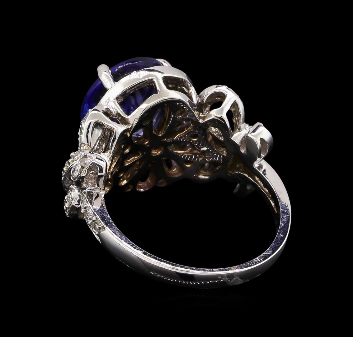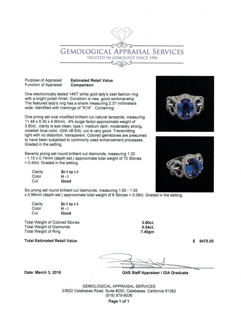 One electronically tested 14KT white gold lady's cast fashion ring with a bright polish finish. The featured lady's ring has a shank measuring 2.37 millimeters wide. Identified with markings of "K14". Condition is new, good workmanship. Containing: One prong set oval modified brilliant cut natural tanzanite, measuring 11.48 x 9.30 x 4.90mm, 4%. bulge factor, approximate weight of 3.80ct., clarity is eye clean, type I, medium dark, moderately strong, violetish blue color, (GIA vB 6/4), cut is very good. Transmitting light with no distortion, transparent. Colored gemstones are presumed to have been subjected to commonly used enhancement processes. Graded in the setting. Seventy prong set round brilliant cut diamonds, measuring 1.20 - 1.15 x 0.74mm (depth est.) approximate total weight of 70 Stones = 0.45ct. Graded in the setting. Clarity: SI-1 to I-1. Color: H - I. Cut Good Six prong set round brilliant cut diamonds, measuring 1.60 - 1.55 x 0.98mm (depth est.) approximate total weight of 6 Stones = 0.09ct. Graded in the setting. Clarity: SI-1 to I-1. Color: H - I. Cut Good. Total Weight of Colored Stones 3.80ct. Total Weight of Diamonds 0.54ct. Total Weight of Ring 7.40gm. GAS Appraised at $9,475.00.