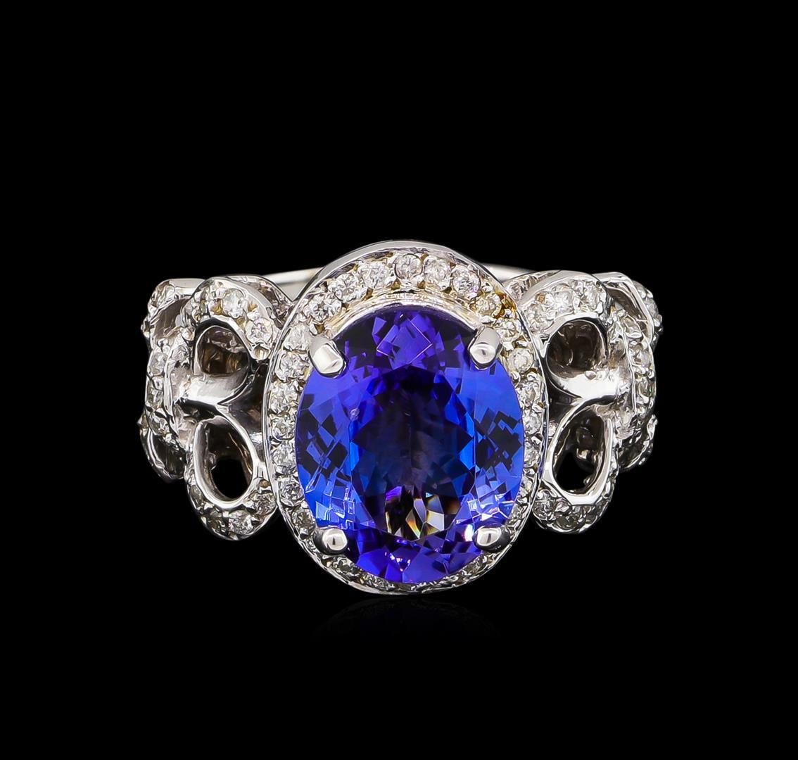 One electronically tested 14KT white gold lady's cast fashion ring with a bright polish finish. The featured lady's ring has a shank measuring 2.37 millimeters wide. Identified with markings of "K14". Condition is new, good workmanship. Containing: One prong set oval modified brilliant cut natural tanzanite, measuring 11.48 x 9.30 x 4.90mm, 4%. bulge factor, approximate weight of 3.80ct., clarity is eye clean, type I, medium dark, moderately strong, violetish blue color, (GIA vB 6/4), cut is very good. Transmitting light with no distortion, transparent. Colored gemstones are presumed to have been subjected to commonly used enhancement processes. Graded in the setting. Seventy prong set round brilliant cut diamonds, measuring 1.20 - 1.15 x 0.74mm (depth est.) approximate total weight of 70 Stones = 0.45ct. Graded in the setting. Clarity: SI-1 to I-1. Color: H - I. Cut Good Six prong set round brilliant cut diamonds, measuring 1.60 - 1.55 x 0.98mm (depth est.) approximate total weight of 6 Stones = 0.09ct. Graded in the setting. Clarity: SI-1 to I-1. Color: H - I. Cut Good. Total Weight of Colored Stones 3.80ct. Total Weight of Diamonds 0.54ct. Total Weight of Ring 7.40gm. GAS Appraised at $9,475.00.