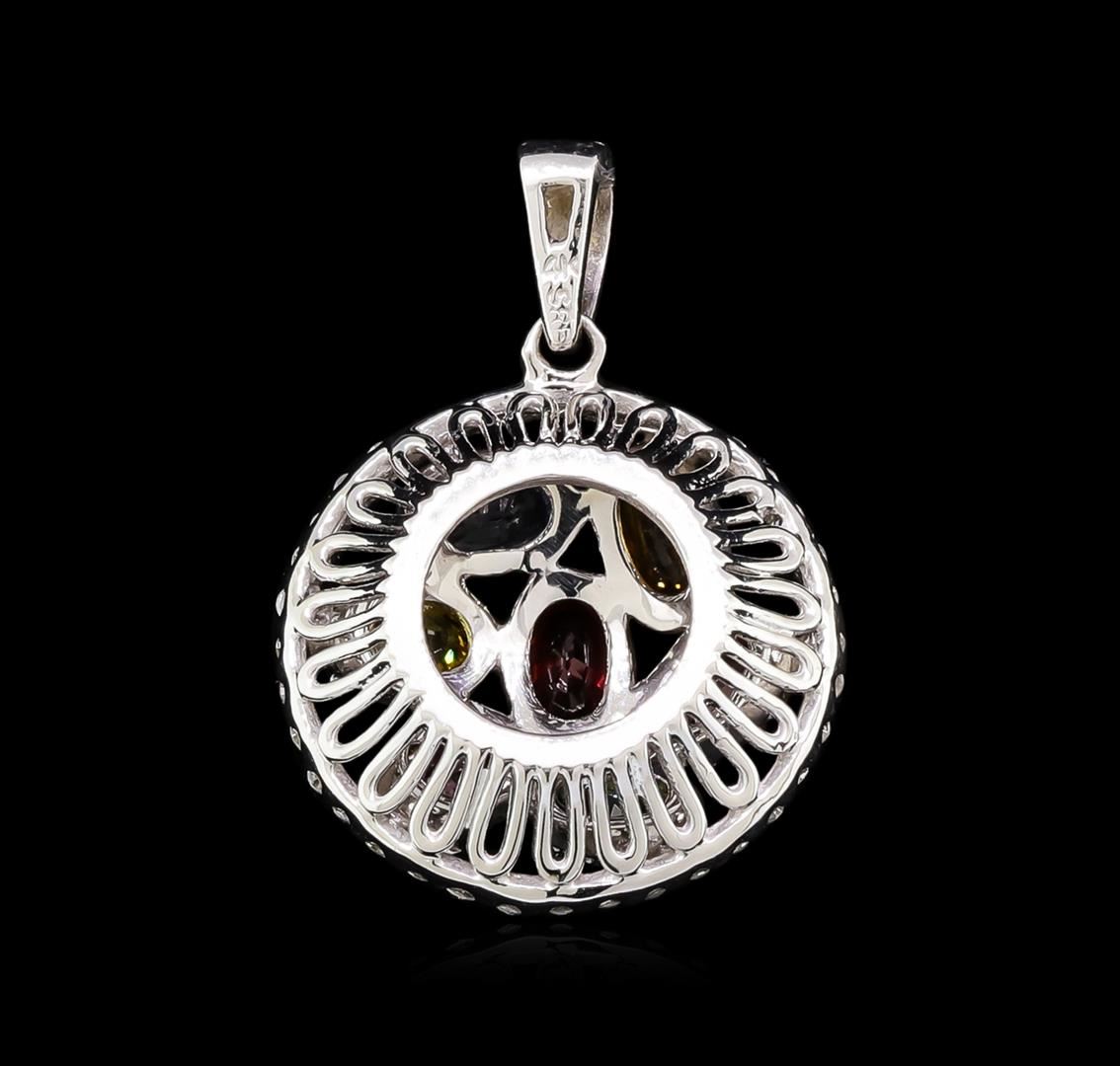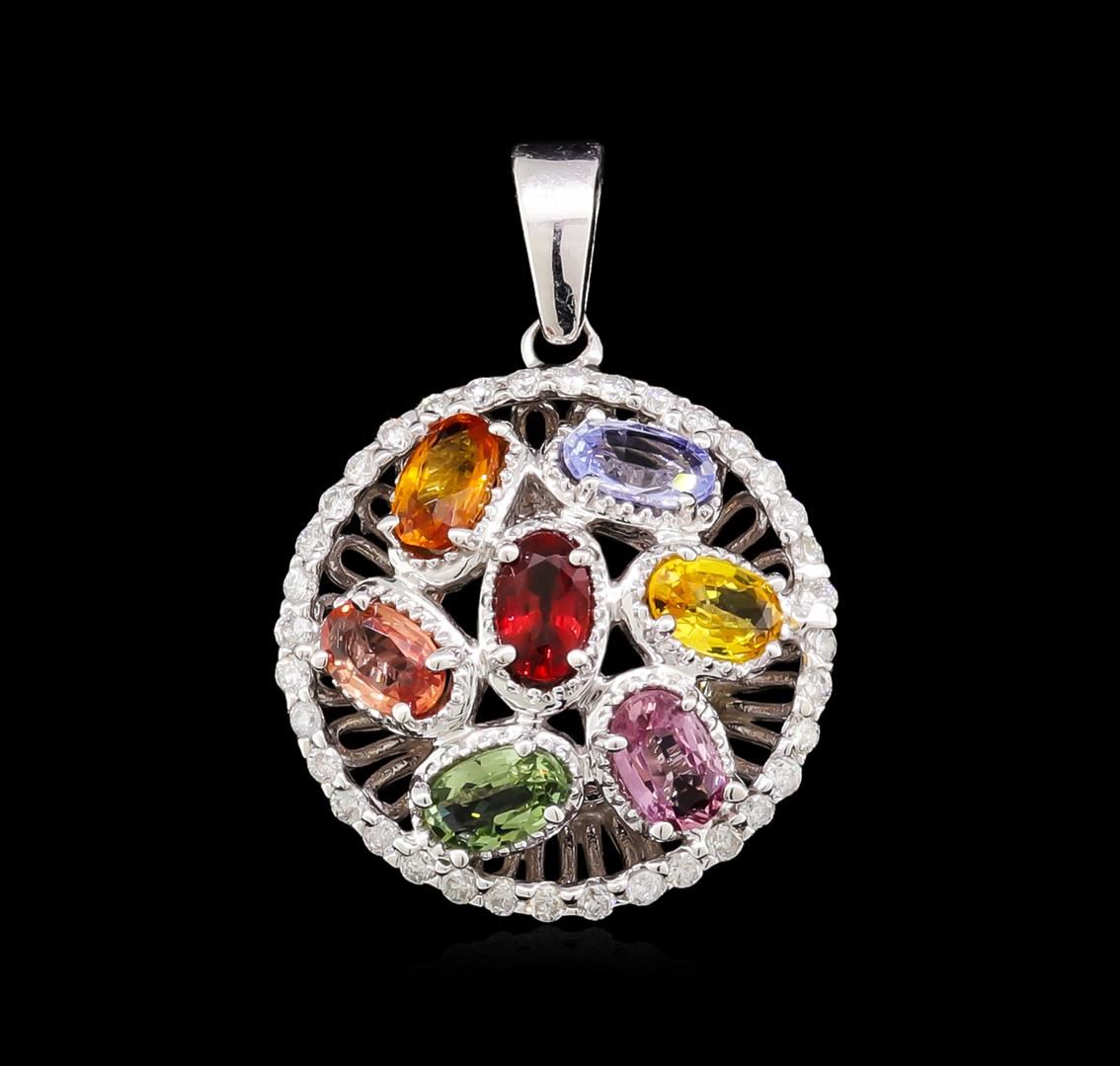 One electronically tested 14KT white gold lady's combination cast & assembled round fashion pendant with a bright polish finish. The featured lady's pendant has a diameter of 18.5 millimeters. Identified with markings of "14K". Condition is new, good workmanship. Containing: Seven prong set oval modified brilliant cut natural multi-color sapphires, measuring 5.20 x 3.40 x 2.21mm, approximate total weight of 3.80ct., clarity is slightly included, cut is very good. Colored gemstones are presumed to have been subjected to commonly used enhancement processes. Graded in the setting. The featured sapphires range in color from pink to yellow to light blue to orange to green to reddish orange. Thirty-Six prong set round brilliant cut diamonds, measuring 1.40 - 1.30 x 0.85mm (depth est.) approximate total weight of 36 Stones = 0.34ct. Graded in the setting. Clarity: SI-1 to I-1. Color: G - Good. Total Weight of Colored Stones 3.80ct. Total Weight of Diamonds 0.34ct. Total Weight of Pendant 4.40gm. GAS Appraised at $3,800.00.
