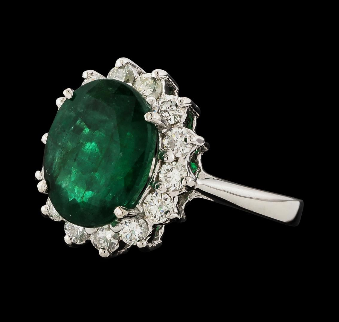 One electronically tested 14KT white gold lady's cast fashion ring with a basket halo with a bright polish finish. The featured lady's ring has a shank measuring 1.85 millimeters wide. Identified with markings of 'K14'. Condition is new, good workmanship. Containing: One prong set oval modified mixed cut natural emerald, measuring 11.52 x 9.00 x 4.97mm, (depth est.) 20%. bulge factor, approximate weight of 3.81ct., clarity is heavily included, medium dark, moderately strong, green color, (GIA G 6/4), cut is good. Transmitting light somewhat diffusely, semi-transparent to translucent. Naturally occurring internal & external characteristics are present. Indications of oil residue. Colored gemstones are presumed to have been subjected to commonly used enhancement processes. Graded in the setting. Fourteen prong set round brilliant cut diamonds, measuring 2.40 - 2.30 x 1.46mm (depth est.) approximate total weight of 14 Stones = 0.70ct. Graded in the setting. Clarity SI-1 to I-1. Color: G - I Cut Good. Total Weight of Colored Stones 3.81ct.. Total Weight of Diamonds 0.70ct.. Total Weight of Ring 4.10gm. GAS Appraised at $6,760.00.