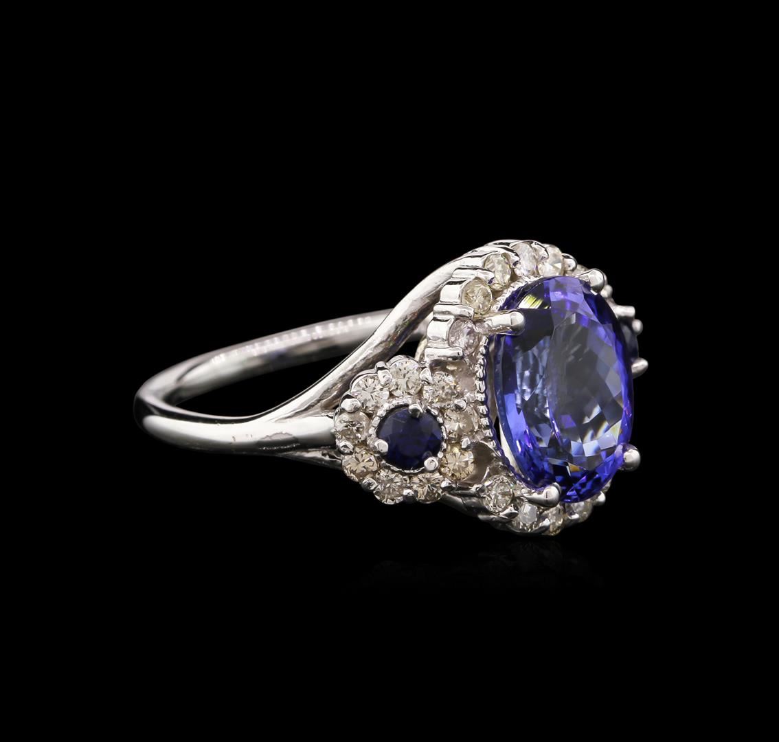 One electronically tested 14KT white gold ladies cast tanzanite, sapphire and diamond ring with a bright polish finish. Identified with markings of "14K". Condition is new. Containing: One prong set oval modified brilliant cut natural tanzanite, measuring 11.00 x 8.70 x 5.66mm, approximate weight of 3.81ct., clarity is eye clean, type I, medium, moderately strong, bluish violet color, (GIA bV 5/4), cut is good. Two prong set round modified brilliant cut natural blue sapphires, measuring 3.00 - 3.00 x 1.95 mm, approximate. Total Weight of 0.28ct., clarity is moderately included, type II, medium, moderately strong, blue color, (GIA B 5/4), cut is good. Thirty prong set round brilliant cut diamonds, measuring 1.50 - 1.50 x 0.90mm (depth est.) approximate. Total Weight of 30 Stones = 0.37ct. Clarity: SI-1. Color: I - J, Cut is Good. Colored gemstones are presumed to have been subjected to commonly used enhancement processes. All diamonds and colored gemstones are graded in the mounting, unless otherwise stated. Total Weight of Colored Stones 4.09ct. Total Weight of Diamonds 0.37ct. Total Weight of Ring 6.40 grams. GGL Appraised at $4,525.00.
