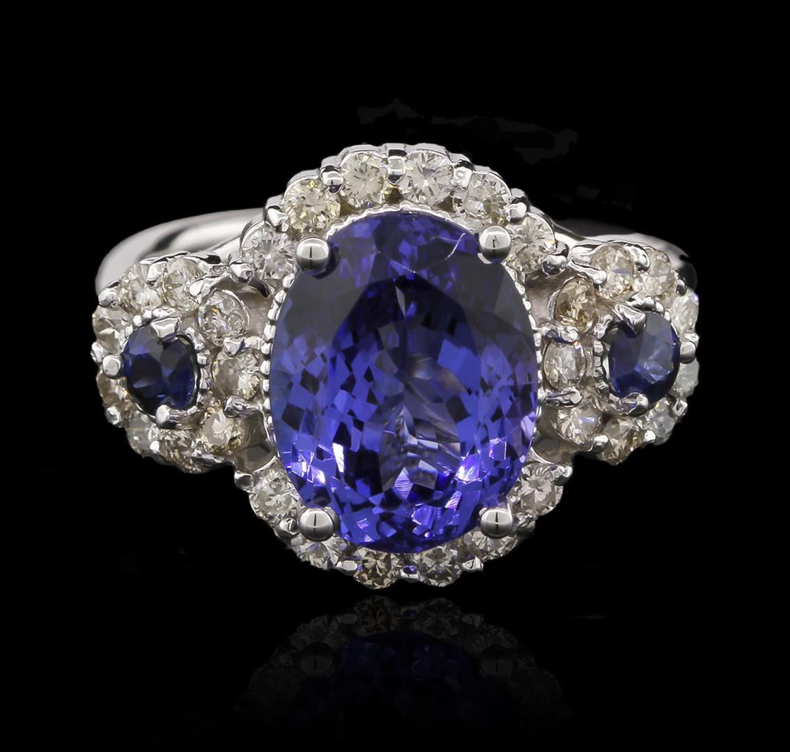 One electronically tested 14KT white gold ladies cast tanzanite, sapphire and diamond ring with a bright polish finish. Identified with markings of "14K". Condition is new. Containing: One prong set oval modified brilliant cut natural tanzanite, measuring 11.00 x 8.70 x 5.66mm, approximate weight of 3.81ct., clarity is eye clean, type I, medium, moderately strong, bluish violet color, (GIA bV 5/4), cut is good. Two prong set round modified brilliant cut natural blue sapphires, measuring 3.00 - 3.00 x 1.95 mm, approximate. Total Weight of 0.28ct., clarity is moderately included, type II, medium, moderately strong, blue color, (GIA B 5/4), cut is good. Thirty prong set round brilliant cut diamonds, measuring 1.50 - 1.50 x 0.90mm (depth est.) approximate. Total Weight of 30 Stones = 0.37ct. Clarity: SI-1. Color: I - J, Cut is Good. Colored gemstones are presumed to have been subjected to commonly used enhancement processes. All diamonds and colored gemstones are graded in the mounting, unless otherwise stated. Total Weight of Colored Stones 4.09ct. Total Weight of Diamonds 0.37ct. Total Weight of Ring 6.40 grams. GGL Appraised at $4,525.00.