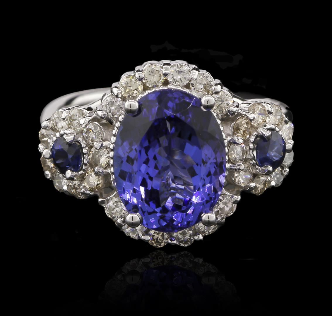One electronically tested 14KT white gold ladies cast tanzanite, sapphire and diamond ring with a bright polish finish. Identified with markings of "14K". Condition is new. Containing: One prong set oval modified brilliant cut natural tanzanite, measuring 11.00 x 8.70 x 5.66mm, approximate weight of 3.81ct., clarity is eye clean, type I, medium, moderately strong, bluish violet color, (GIA bV 5/4), cut is good. Two prong set round modified brilliant cut natural blue sapphires, measuring 3.00 - 3.00 x 1.95 mm, approximate. Total Weight of 0.28ct., clarity is moderately included, type II, medium, moderately strong, blue color, (GIA B 5/4), cut is good. Thirty prong set round brilliant cut diamonds, measuring 1.50 - 1.50 x 0.90mm (depth est.) approximate. Total Weight of 30 Stones = 0.37ct. Clarity: SI-1. Color: I - J, Cut is Good. Colored gemstones are presumed to have been subjected to commonly used enhancement processes. All diamonds and colored gemstones are graded in the mounting, unless otherwise stated. Total Weight of Colored Stones 4.09ct. Total Weight of Diamonds 0.37ct. Total Weight of Ring 6.40 grams. GGL Appraised.