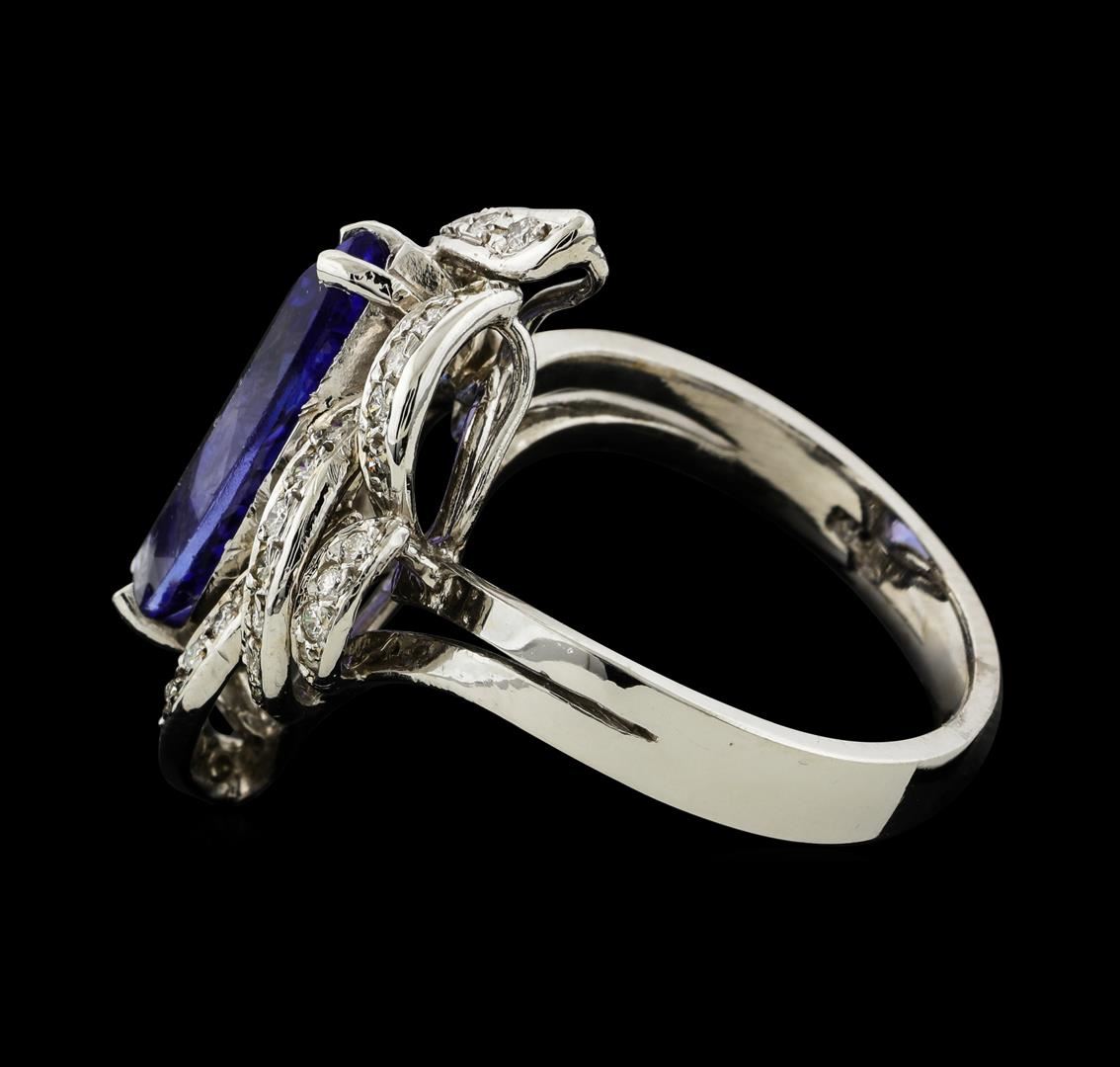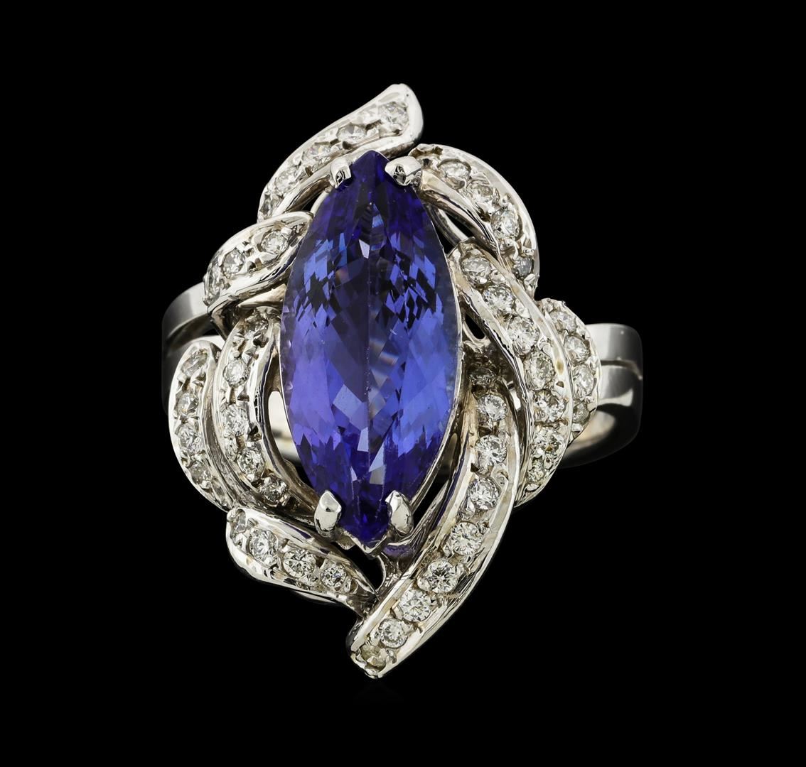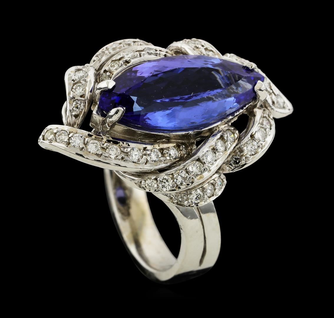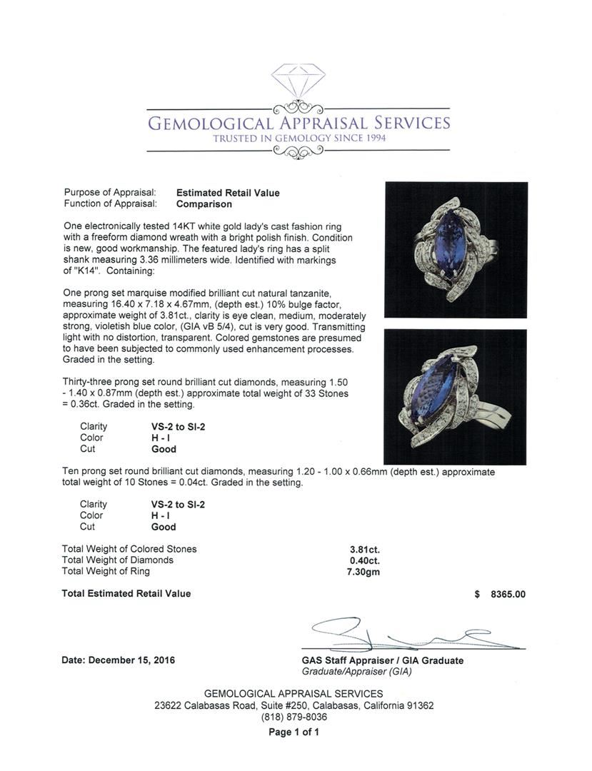One electronically tested 14KT white gold lady's cast fashion ring with a freeform diamond wreath with a bright polish finish. The featured lady's ring has a split shank measuring 3.36 millimeters wide. Identified with markings of 'K14'. Condition is new, good workmanship. Containing: One prong set marquise modified brilliant cut natural tanzanite, measuring 16.40 x 7.18 x 4.67mm, (depth est.) 10%. bulge factor, approximate weight of 3.81ct., clarity is eye clean, medium, moderately strong, violetish blue color, (GIA vB 5/4), cut is very good. Transmitting light with no distortion, transparent. Colored gemstones are presumed to have been subjected to commonly used enhancement processes. Graded in the setting. Thirty-Three prong set round brilliant cut diamonds, measuring 1.50 - 1.40 x 0.87mm (depth est.) approximate total weight of 33 Stones = 0.36ct. Graded in the setting. Clarity VS-2 to SI-2. Color: H - I Cut Good Ten prong set round brilliant cut diamonds, measuring 1.20 - 1.00 x 0.66mm (depth est.) approximate total weight of 10 Stones = 0.04ct. Graded in the setting. Clarity VS-2 to SI-2. Color: H - I Cut Good. Total Weight of Colored Stones 3.81ct.. Total Weight of Diamonds 0.40ct.. Total Weight of Ring 7.30gm. GAS Appraised at $8,365.00.
