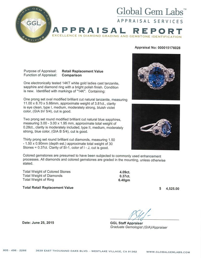 One electronically tested 14KT white gold ladies cast tanzanite, sapphire and diamond ring with a bright polish finish. Identified with markings of "14K". Condition is new. Containing: One prong set oval modified brilliant cut natural tanzanite, measuring 11.00 x 8.70 x 5.66mm, approximate weight of 3.81ct., clarity is eye clean, type I, medium, moderately strong, bluish violet color, (GIA bV 5/4), cut is good. Two prong set round modified brilliant cut natural blue sapphires, measuring 3.00 - 3.00 x 1.95 mm, approximate. Total Weight of 0.28ct., clarity is moderately included, type II, medium, moderately strong, blue color, (GIA B 5/4), cut is good. Thirty prong set round brilliant cut diamonds, measuring 1.50 - 1.50 x 0.90mm (depth est.) approximate. Total Weight of 30 Stones = 0.37ct. Clarity: SI-1. Color: I - J, Cut is Good. Colored gemstones are presumed to have been subjected to commonly used enhancement processes. All diamonds and colored gemstones are graded in the mounting, unless otherwise stated. Total Weight of Colored Stones 4.09ct. Total Weight of Diamonds 0.37ct. Total Weight of Ring 6.40 grams. GGL Appraised at $4,525.00.