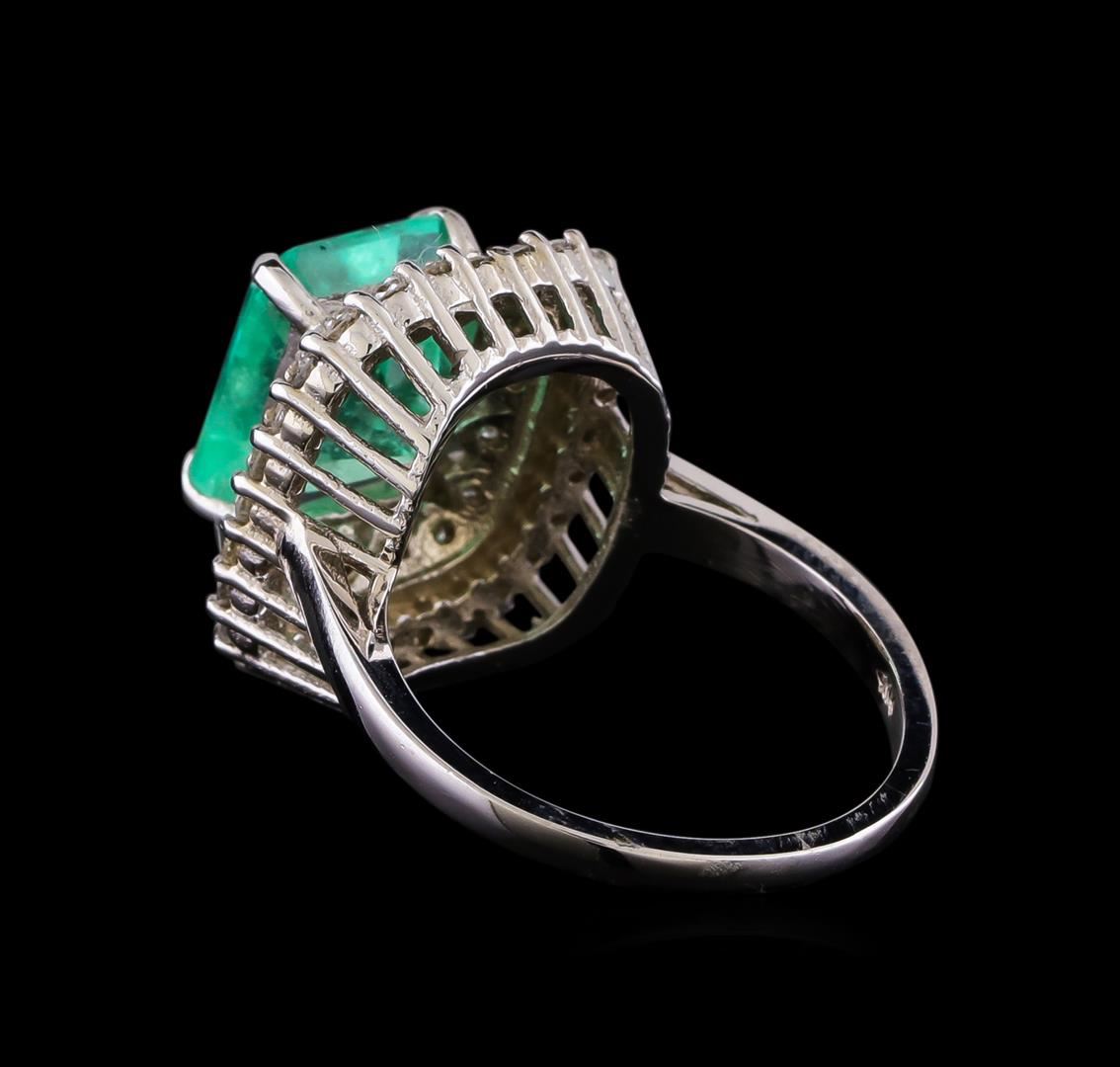 One electronically tested 14KT white gold lady's cast fashion ring with a double basket halo with a bright polish finish. The featured lady's has a shank measuring 1.62 millimeters in width. Identified with markings of "K14". Condition is new, good workmanship. Containing: One prong set emerald step cut natural emerald, measuring 10.68 x 8.64 x 6.45mm, (depth est.) approximate weight of 3.83ct., clarity is slightly included, medium light, moderately strong, green color, (GIA G 4/4), cut is good. Transmitting light with a minimum of distortion, transparent. Indications of oil residue. Naturally occurring internal & external characteristics are present. Colored gemstones are presumed to have been subjected to commonly used enhancement processes. Graded in the setting. Twenty-Eight prong set round brilliant cut diamonds, measuring 1.90 - 1.80 x 1.14mm (depth est.) approximate total weight of 28 Stones = 0.68ct. Graded in the setting. Clarity: SI-1 to SI-2. Color: H - I. Cut Good Sixteen prong set round brilliant cut diamonds, measuring 1.40 - 1.35 x 0.86mm (depth est.) approximate total weight of 16 Stones = 0.17ct. Graded in the setting. Clarity: SI-1 to SI-2. Color: H - I. Cut Good. Total Weight of Colored Stones 3.83ct. Total Weight of Diamonds 0.85ct. Total Weight of Ring 6.60gm. GAS Appraised.