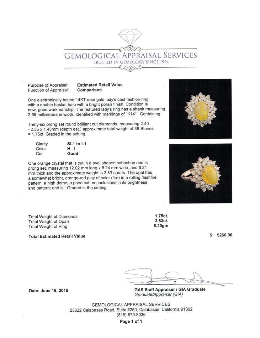 One electronically tested 14KT rose gold lady's cast fashion ring with a double basket halo with a bright polish finish. The featured lady's ring has a shank measuring 2.65 millimeters in width. Identified with markings of "K14". Condition is new, good workmanship. Containing: Thirty-Six prong set round brilliant cut diamonds, measuring 2.40 - 2.35 x 1.45mm (depth est.) approximate total weight of 36 Stones = 1.75ct. Graded in the setting. Clarity: SI-1 to I-1. Color: H - I. Cut Good One orange crystal that is cut in a oval shaped cabochon and is prong set, measuring 12.02 mm long x 8.24 mm wide, and 6.21 mm thick and the approximate weight is 3.83 carats. The opal has a somewhat bright, orange-red play of color (fire) in a rolling flashfire pattern; a high dome; a good cut; no inclusions in its brightness and pattern; and is. Graded in the setting. Total Weight of Diamonds 1.75ct. Total Weight of Opals 3.83ct. Total Weight of Ring 8.20gm GAS Appraised.