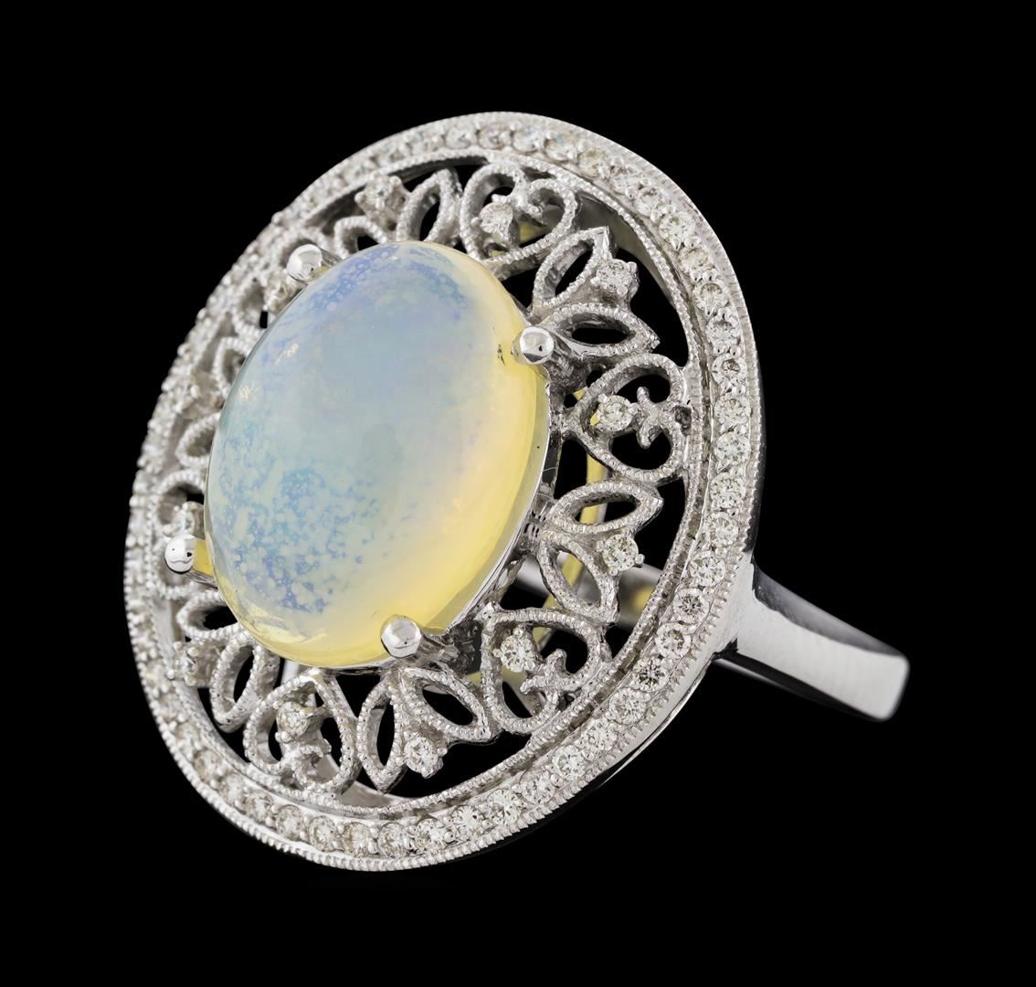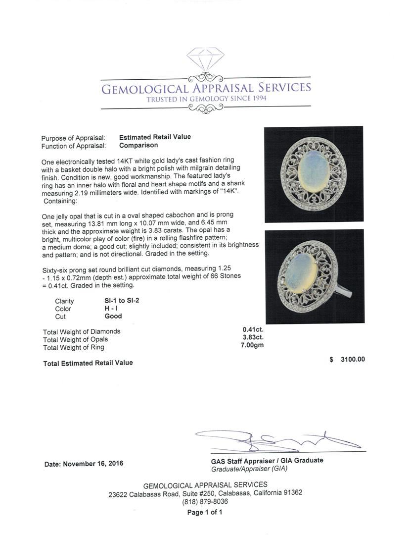 One electronically tested 14KT white gold lady's cast fashion ring with a basket double halo with a bright polish with milgrain detailing finish. The featured lady's ring has an inner halo with floral and heart shape motifs and a shank measuring 2.19 millimeters wide. Identified with markings of '14K'. Condition is new, good workmanship. Containing: One jelly opal that is cut in a oval shaped cabochon and is prong set, measuring 13.81 mm long x 10.07 mm wide, and 6.45 mm thick and the approximate weight is 3.83 carats. The opal has a bright, multicolor play of color (fire) in a rolling flashfire pattern; a medium dome; a good cut; slightly included; consistent in its brightness and pattern; and is not directional. Graded in the setting. Sixty-Six prong set round brilliant cut diamonds, measuring 1.25 - 1.15 x 0.72mm (depth est.) approximate total weight of 66 Stones = 0.41ct. Graded in the setting. Clarity SI-1 to SI-2. Color: H - I Cut Good. Total Weight of Diamonds 0.41ct.. Total Weight of Opals 3.83ct.. Total Weight of Ring 7.00gm. GAS Appraised at $3,100.00.