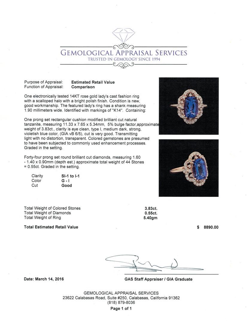 One electronically tested 14KT rose gold lady's cast fashion ring with a scalloped halo with a bright polish finish. The featured lady's ring has a shank measuring 1.90 millimeters wide. Identified with markings of "K14". Condition is new, good workmanship. Containing: One prong set rectangular cushion modified brilliant cut natural tanzanite, measuring 11.33 x 7.65 x 5.34mm, 5%. bulge factor, approximate weight of 3.83ct., clarity is eye clean, type I, medium dark, strong, violetish blue color, (GIA vB 6/5), cut is very good. Transmitting light with no distortion, transparent. Colored gemstones are presumed to have been subjected to commonly used enhancement processes. Graded in the setting. Forty-Four prong set round brilliant cut diamonds, measuring 1.60 - 1.40 x 0.90mm (depth est.) approximate total weight of 44 Stones = 0.55ct. Graded in the setting. Clarity: SI-1 to I-1. Color: G - I. Cut Good. Total Weight of Colored Stones 3.83ct. Total Weight of Diamonds 0.55ct. Total Weight of Ring 5.40gm. GAS Appraised at $8,890.00.